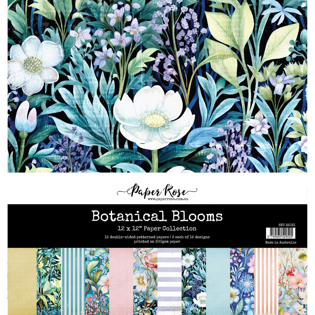 The Paper Rose Botanical Blooms Paper contains 12 double-sided sheets, each measuring approximately 12 x 12 inches with a sturdy weight of 200gsm. With 2 sheets of each of the 12 designs included in the package, you'll have plenty of creative options. The designs showcase vibrant florals, lush greenery, and branches bursting with blooms, accompanied by charming patterns and stripes in delightful shades of pinks, blues, and yellows. Adding an extra layer of visual interest, many pages feature subtle white writing atop the images, imparting a nuanced collage-like effect.