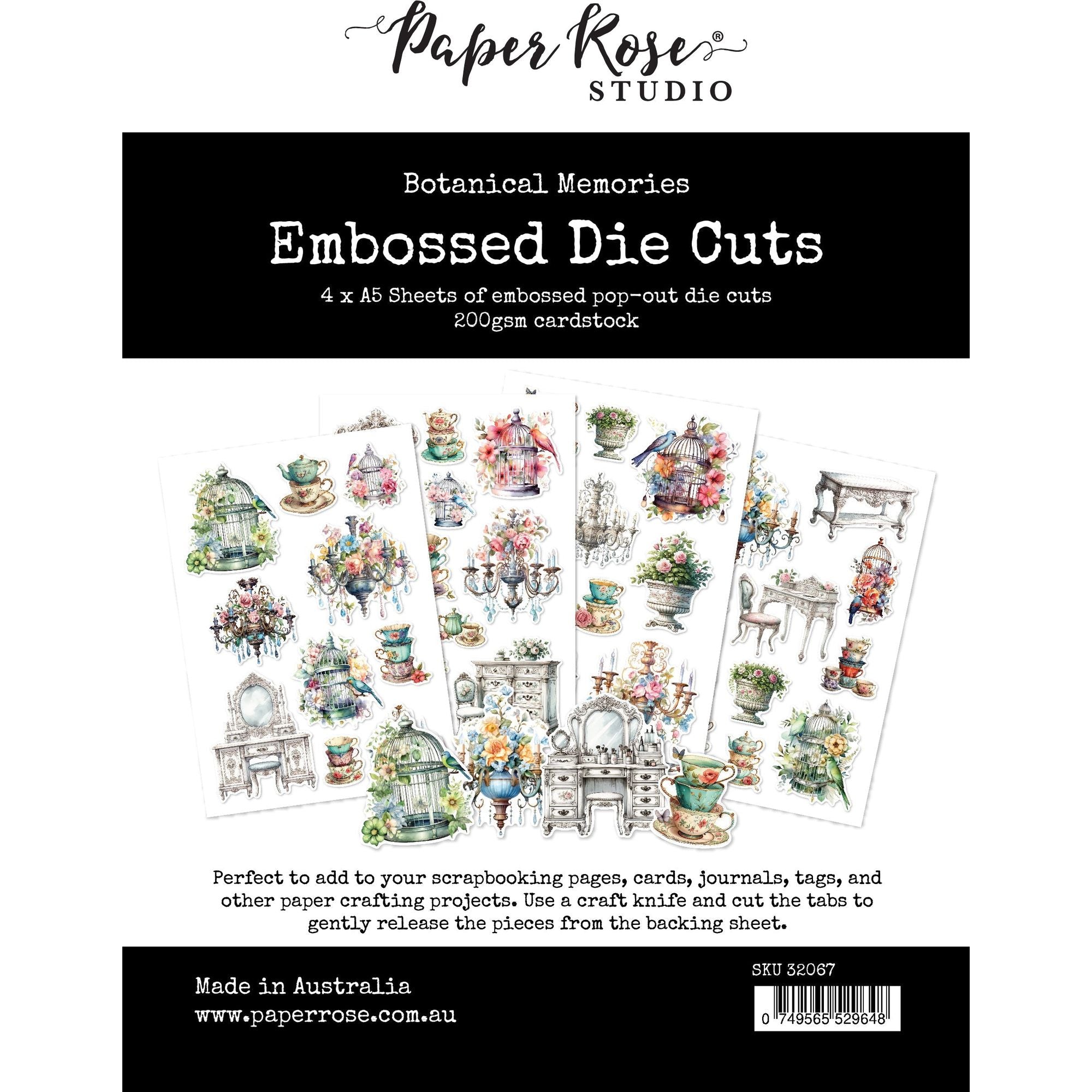 The Paper Rose Botanical Memories Embossed Die Cuts offer a delightful selection of ephemera for your crafting projects. Each set includes four A5 sheets of pop-out die cuts, meticulously crafted from durable 200gsm paper for easy release from the backing sheet. Featuring printed images with selectively embossed areas, these die cuts add depth and dimension to your creations. To use, simply employ a craft knife to carefully cut the tabs, allowing the die cuts to be gently removed without any damage. The ephemera include chandeliers filled with candles and flowers, birds and birdcages, stacked teacups, urns of flowers, and Victorian furniture such as a vanity, desk and chair, coffee tables, and dresser drawers.