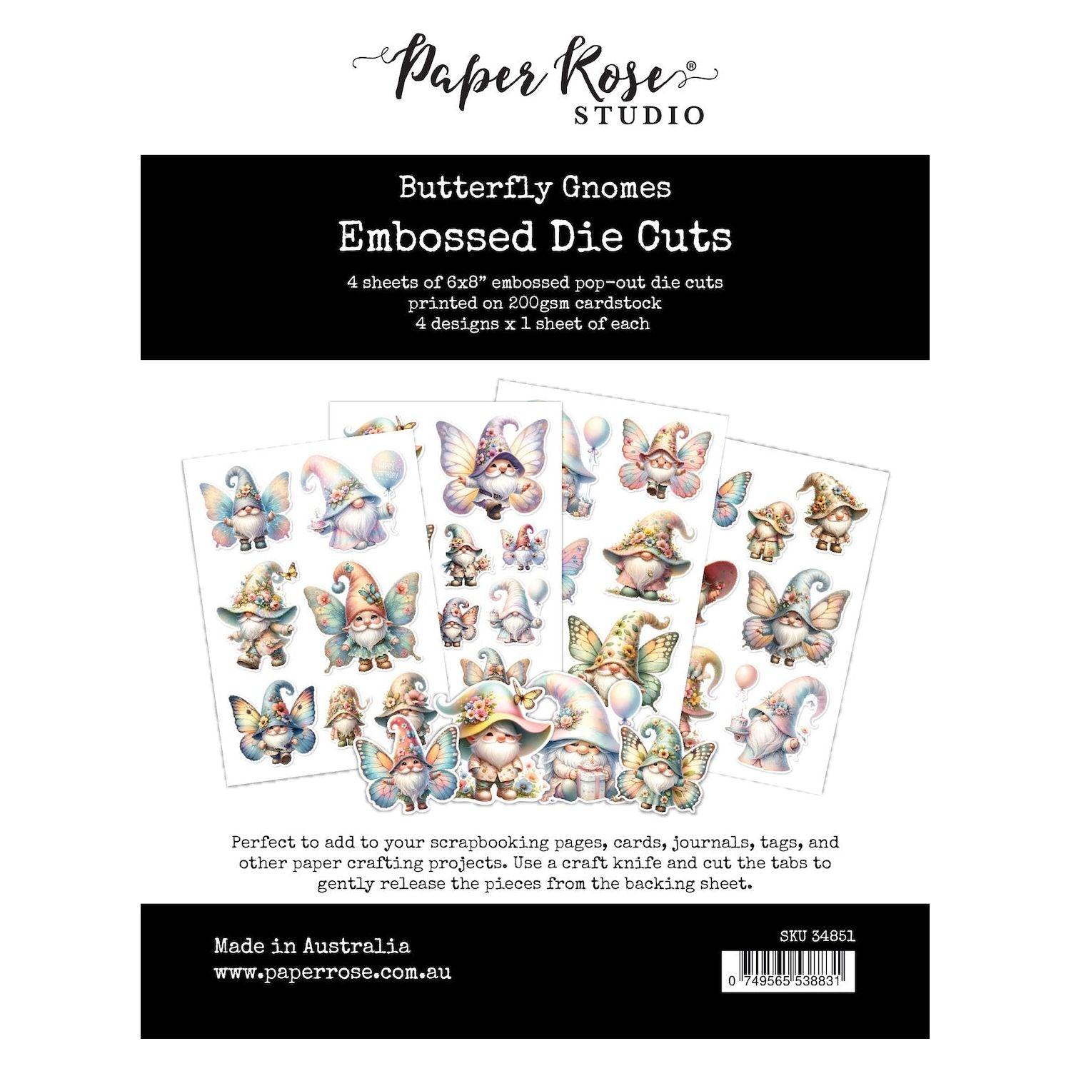 Paper Rose Butterfly Gnomes Embossed Die Cuts add a touch of whimsy and delightful detail to your craft projects. This set includes four A5 sheets (approximately 6 x 8 inches) of pop-out die cuts, made from sturdy 200gsm paper for easy removal. Each piece features selectively embossed accents for added texture and dimension. Designs showcase pastel-colored gnomes adorned with butterfly or fairy wings, intricate hats, and charming accessories like flowers and balloons—perfect for cards, journals, and mixed-media creations.