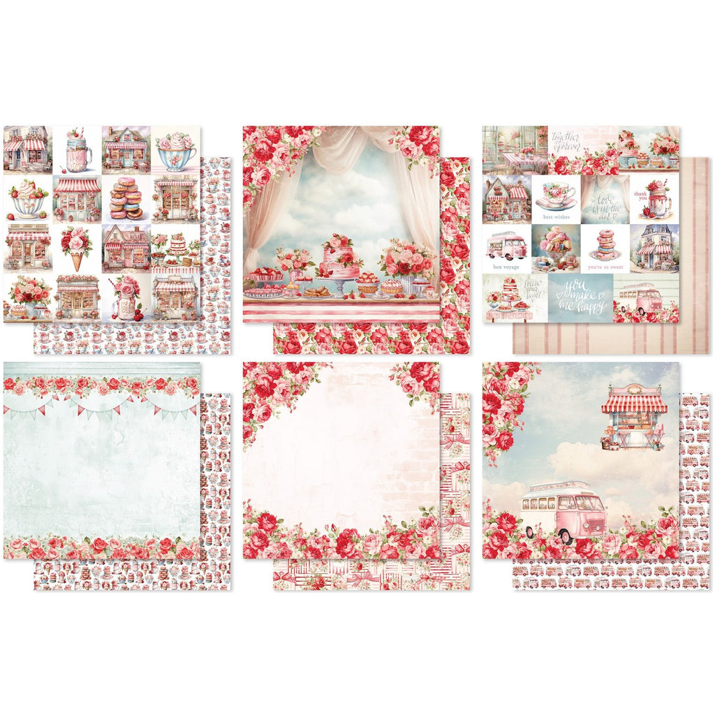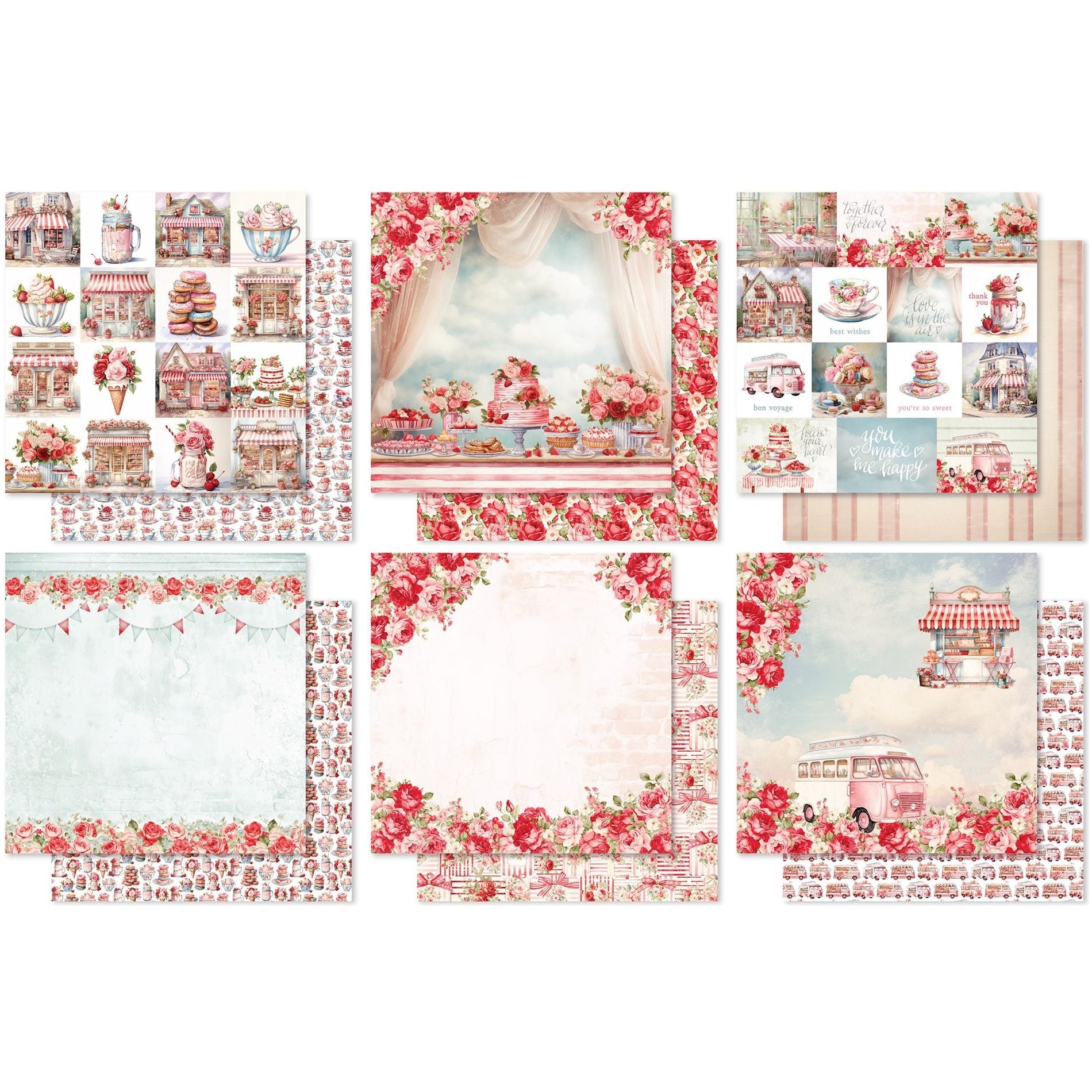 Paper Rose Candy Kisses 6x6 Paper offers a delightful assortment of creative possibilities. This package includes a total of 18 double-sided sheets, each measuring approximately 6 x 6 inches with a sturdy weight of 200gsm. Inside the pack, you'll find a fantastic variety, with 3 sheets of each of the 12 enchanting designs. These designs encompass pink and red flowers, Volkswagon Vans, campers, pennants, bows, desserts, bouquets, bakery storefronts, cookies, milkshakes, cakes on pedestals, stripes, and some ATC cards with the following sayings “Together Forever,” “Best Wishes,” “Live is in the Air,” “Thank You,” “Bon voyage,” “You’re so sweet,” “Follow your heart,” and “You make me happy.”