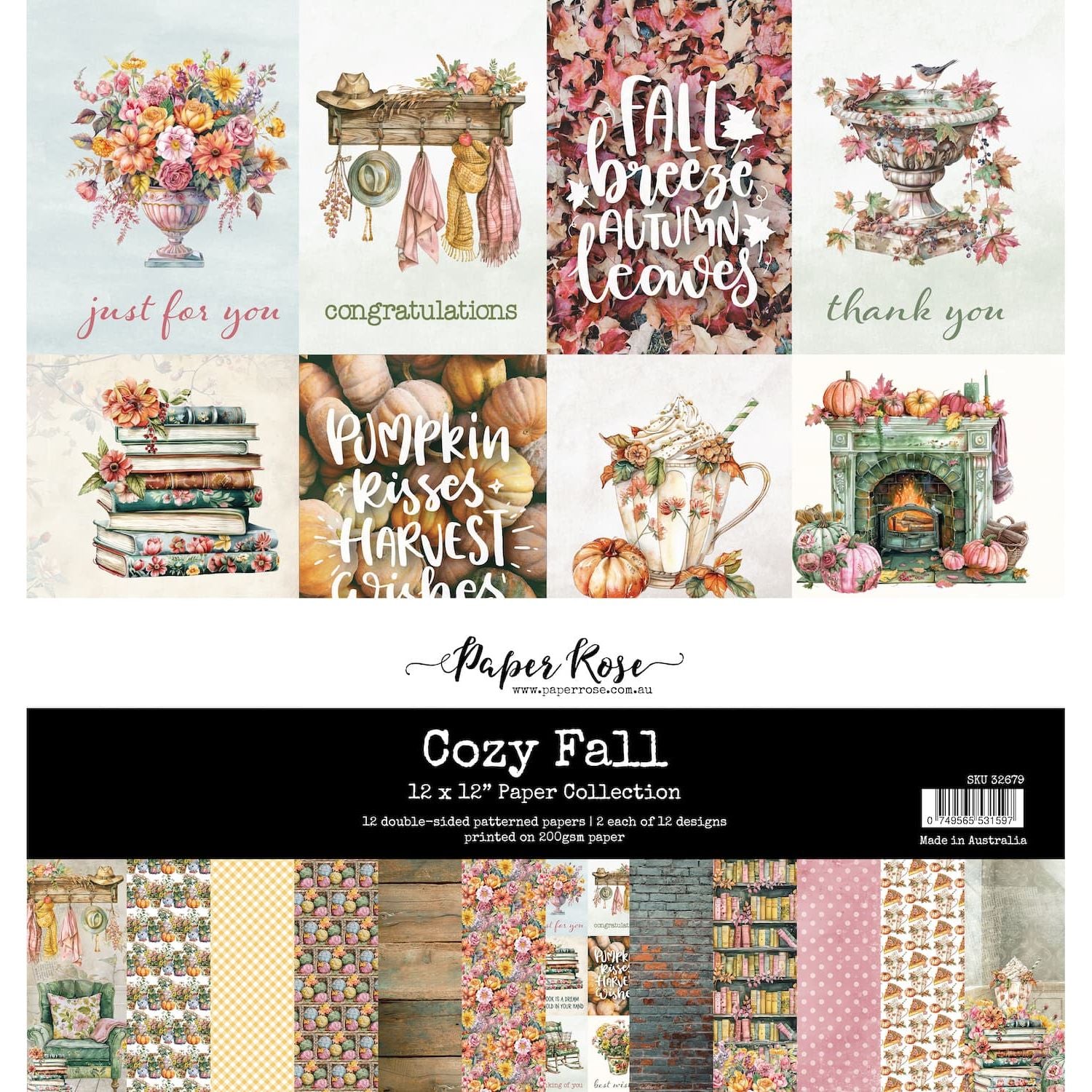 The Paper Rose Cozy Fall Paper adds a warm and inviting touch to your crafting projects. It includes 12 double-sided sheets, each measuring approximately 12 x 12 inches and boasting a sturdy weight of 200gsm. With two sheets of each of the 12 designs included in the package, you'll have ample creative options. The designs feature cozy and comforting scenes, such as bookshelves, florals, baskets full of balls of yarn, wooden planks, bricks, polka dots, desserts and drinks, yellow gingham, a scene with a chair near a fireplace, and a scene with a stack of books in front of a window. The set also includes ATC cards with pictures and phrases like "Just for you," "Congratulations," "Fall breeze, autumn leaves," "Thank you," "A book is a dream you hold in your hand," "Pumpkin kisses, harvest wishes," "Warm wishes," "Thankful for you," "Thinking of you," "Best wishes," "Hearts full of thanks," and "Rain or shine, always on my mind." Perfect for adding a cozy, autumnal feel to your cards, scrapbooks, and other projects.