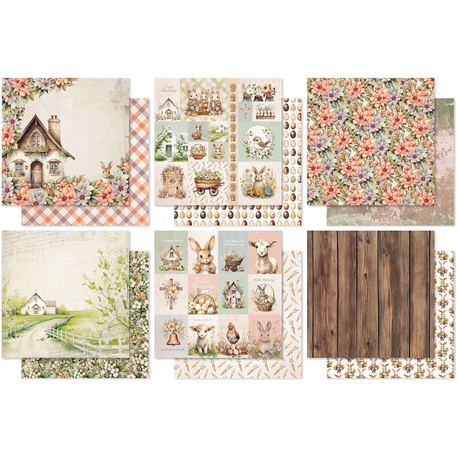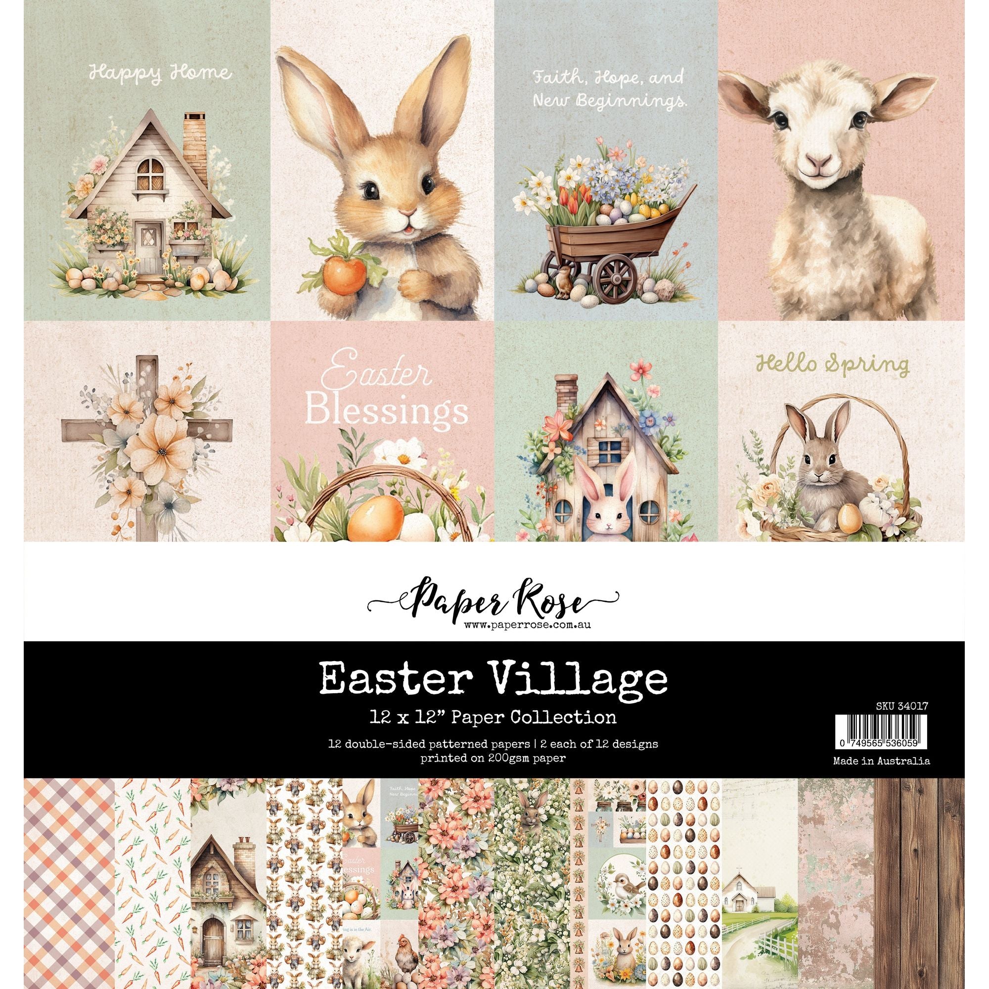 Paper Rose Easter Village Paper is a delightful addition to your crafting supplies. This collection includes 12 double-sided sheets, each measuring approximately 12 x 12 inches and crafted from sturdy 200gsm paper. Featuring 12 unique designs with two sheets of each, the collection showcases charming elements like flowers, wooden slats, carrots, bunny rabbits, a church in a meadow, a country house, Easter eggs, bells, small cards with animals, crosses, baskets, and more. Sentiments included in the collection are: "Happy Home," "Faith," "Hope and New Beginnings," "Easter Blessings," "Hello Spring," "Bloom & Grow," and "Spring is in the Air." This versatile paper pack is ideal for adding a touch of seasonal cheer to your cards, scrapbooks, and other paper crafting projects.