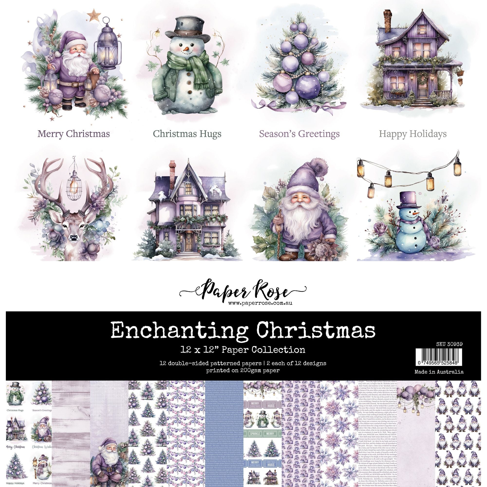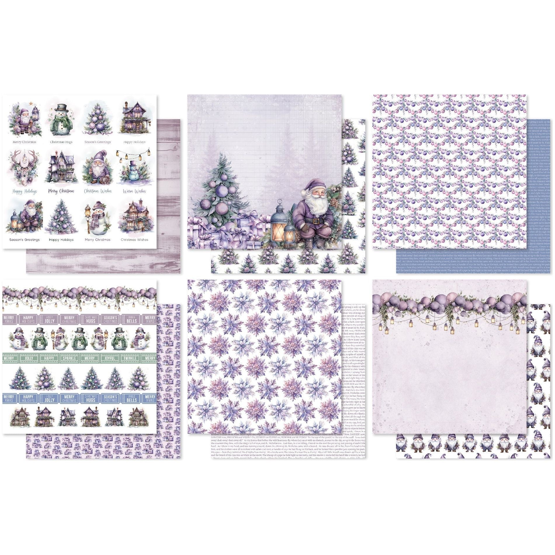 The Paper Rose Enchanting Christmas 12x12 Paper offers a delightful collection of 12 sheets of double-sided patterned paper. With two sheets of each of the 12 unique designs, this pack provides ample creative possibilities. The paper itself measures approximately 12 x 12 inches and boasts a sturdy weight of 200gsm. Within this collection, you'll find a range of enchanting holiday designs, including strings of baubles, delicate flowers, and intricate snowflakes. There are also Santa Gnomes, jolly Santa Claus figures, piles of festive gifts, excerpts from "Twas The Night Before Christmas," charming Christmas trees, adorable snowmen, vintage lanterns, and various other holiday-themed imagery. Additionally, there's a page featuring vintage-looking elements and rows of tickets with phrases like "Merry Christmas," "Holly Jolly," "Happy," "Sparkle," "Twinkle," "Happy Holidays," and more. You'll also discover a page of different icons paired with corresponding words underneath for cutting out together or individually. These include Santa and "Merry Christmas," a snowman and "Christmas Hugs," a beautifully decorated tree with "Season’s Greetings," a Victorian house with "Happy Holidays," and more. All of these charming designs are presented in lovely shades of light purples, adding a touch of holiday magic to your crafting projects.