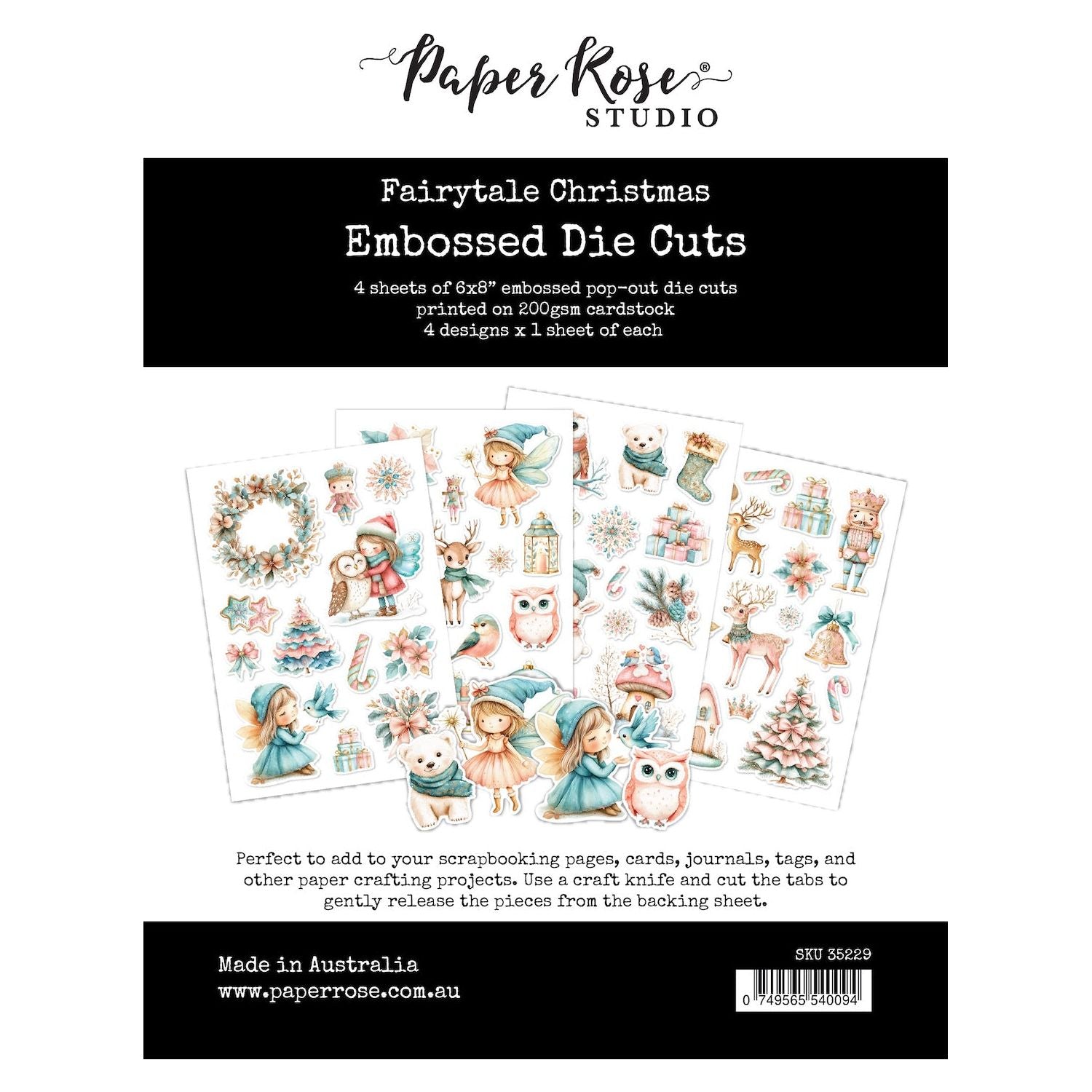 Paper Rose Fairytale Christmas Embossed Die Cuts are a whimsical and versatile addition to your holiday crafting collection. This set includes four A5 sheets (approximately 6 x 8 inches) of pop-out die cuts, made from sturdy 200gsm paper for easy removal and durability. Each piece features selectively embossed accents to add texture and dimension to your projects. Designs include charming fairies in winter hats holding wands or interacting with animals like reindeer and birds, along with festive elements such as trees, wreaths, stars, candy canes, mushrooms, presents, nutcrackers, polar bears, pine branches, cookies, and more. All beautifully illustrated in a soft, magical palette of pinks and blues—perfect for bringing storybook charm to your Christmas cards, tags, and paper crafts.