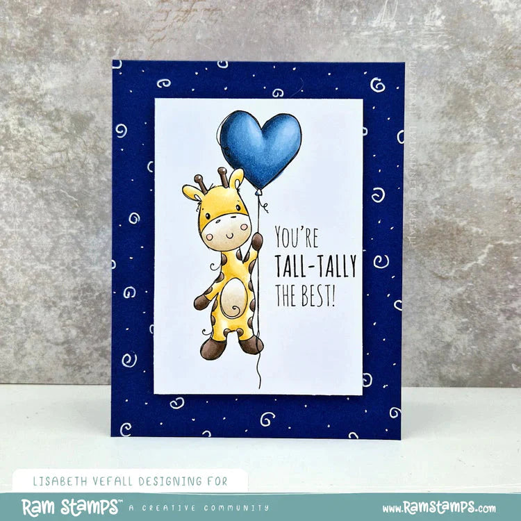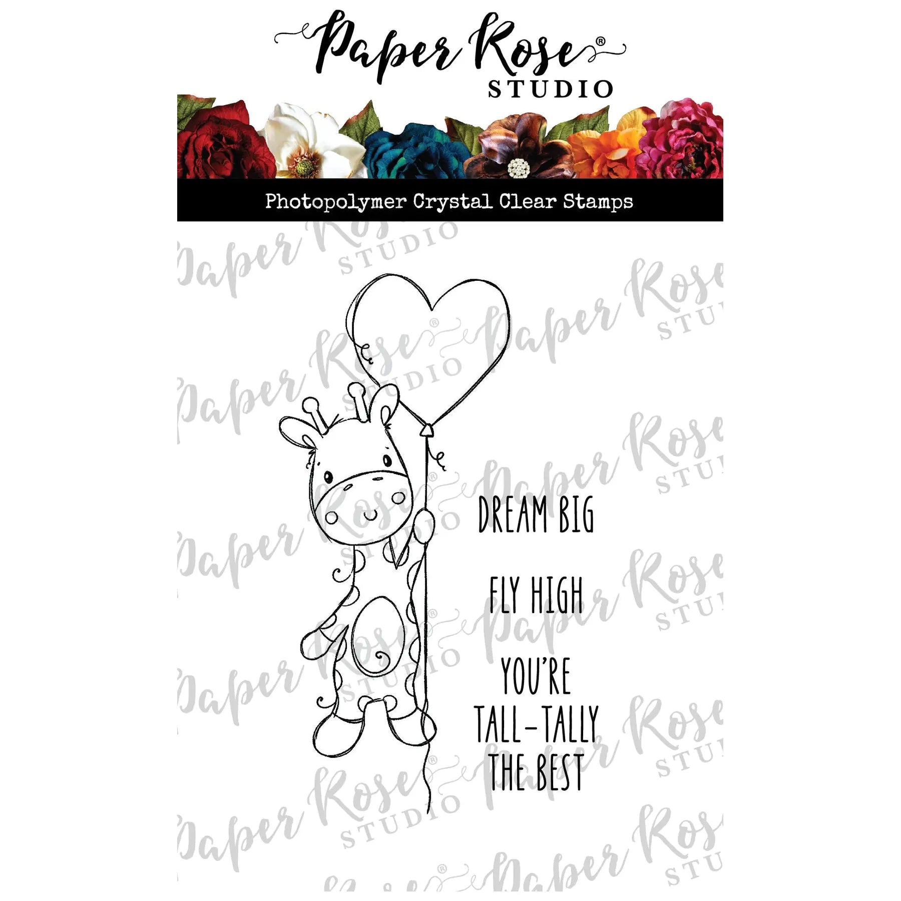 Paper Rose Giraffe Clear Stamps offer a delightful touch to your crafting projects! This set, measuring 5 x 3 inches, features 4 clear, photopolymer stamps. Enjoy charming designs of a lovable giraffe being lifted into the air while grasping a heart-shaped balloon. Sentiments include Dream Big, Fly High, and You’re tall-tally the best.