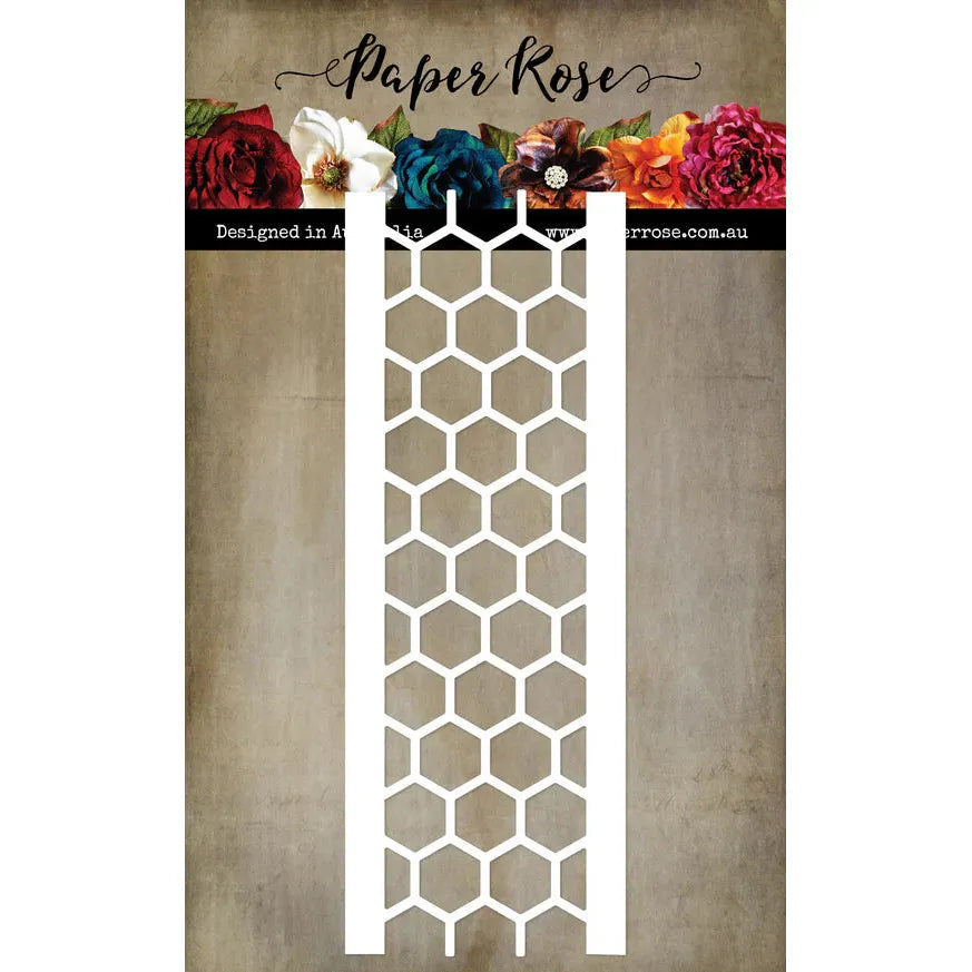 Paper Rose Honeycomb Border Die is part of the Bees and Butterflies Collection. This wafer-thin die, measuring approximately 5.875 x 1.5 inches, is compatible with most die-cutting machines. The design features a wide border of hexagon shapes, perfect for adding a detailed, geometric touch to your cards, scrapbooking projects, and mixed media creations.