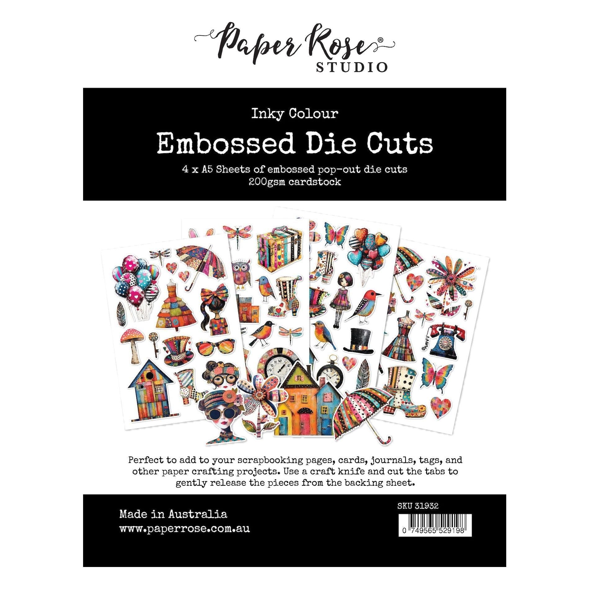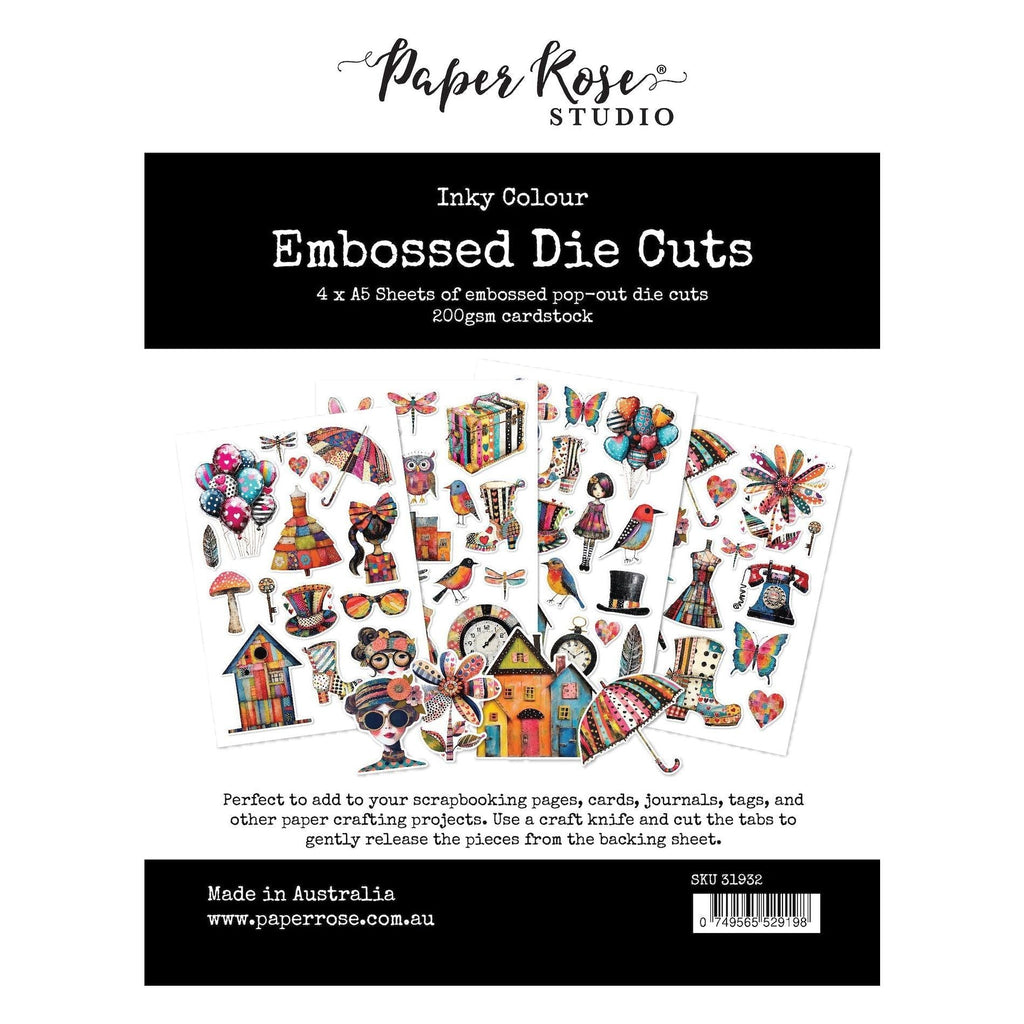 The Paper Rose Inky Colour Embossed Die Cuts offer versatility and quality for your paper crafting endeavors. Crafted from high-quality 200gsm paper, this product enhances scrapbooking pages, cards, journals, tags, planners, and more. Each package contains four A5 sheets of pop-out die cuts featuring brightly colored and whimsical pieces. Among the ephemera, you'll discover an array of captivating ephemera, including houses, vans, scooters, flowers, high heels, dragonflies, umbrellas, boots, butterflies, mushrooms, sunglasses, cars, heart balloons, bunny rabbits, birdhouses, birds, cakes, top hats, telephones, dresses, and an abundance of other delightful motifs. Simply use a craft knife to release them from the backing sheet, ensuring precise removal without damage.