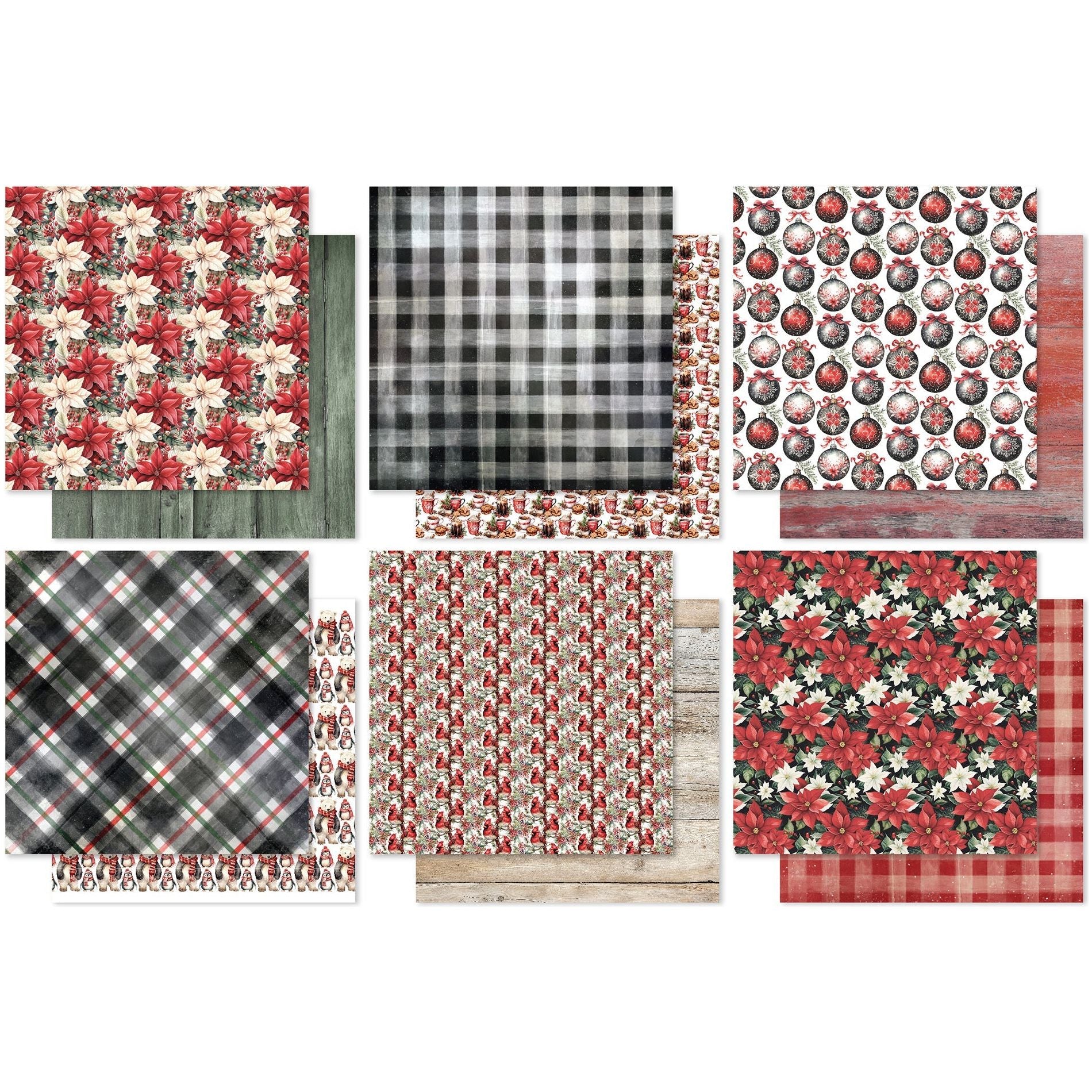 The Paper Rose Jolly Holidays Basics 6x6 Paper offers a festive addition to your crafting supplies. This collection includes 18 double-sided sheets, each measuring approximately 6 x 6 inches and made from sturdy 200gsm paper. With three sheets of each of the 12 included designs, you'll have plenty of creative options. The designs feature plaid patterns in black, red, and black, red and green, poinsettia blooms surrounded by leaves and berries, cups of cocoa and coffee with cookies, ornaments filled with winter designs, worn wood, polar bears and penguins in scarves, cardinals, and word art.