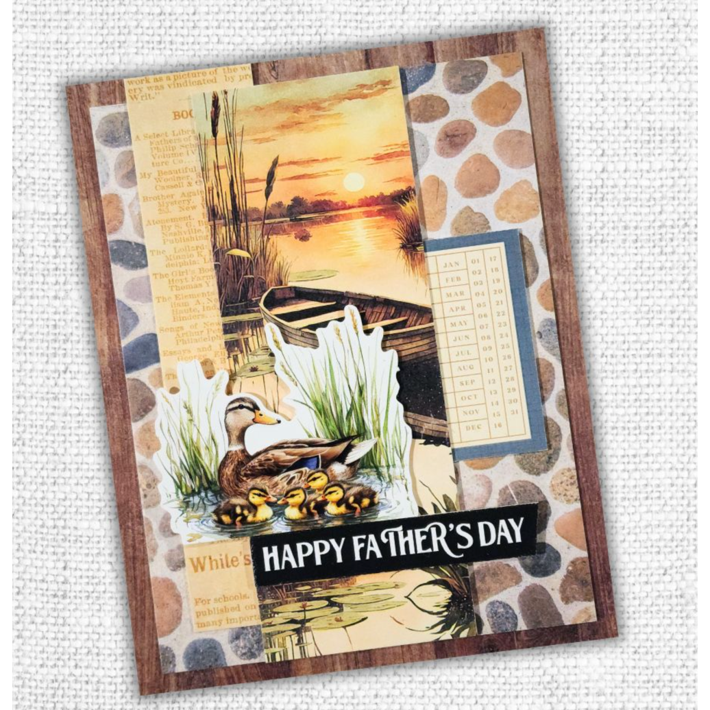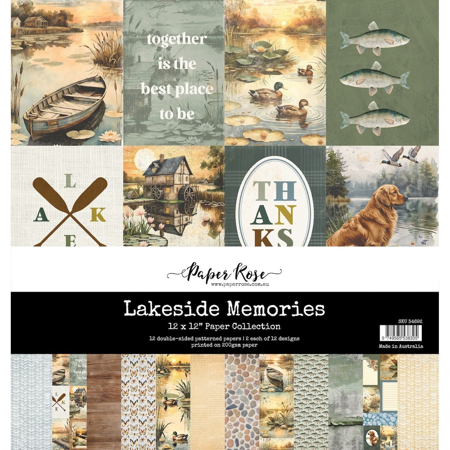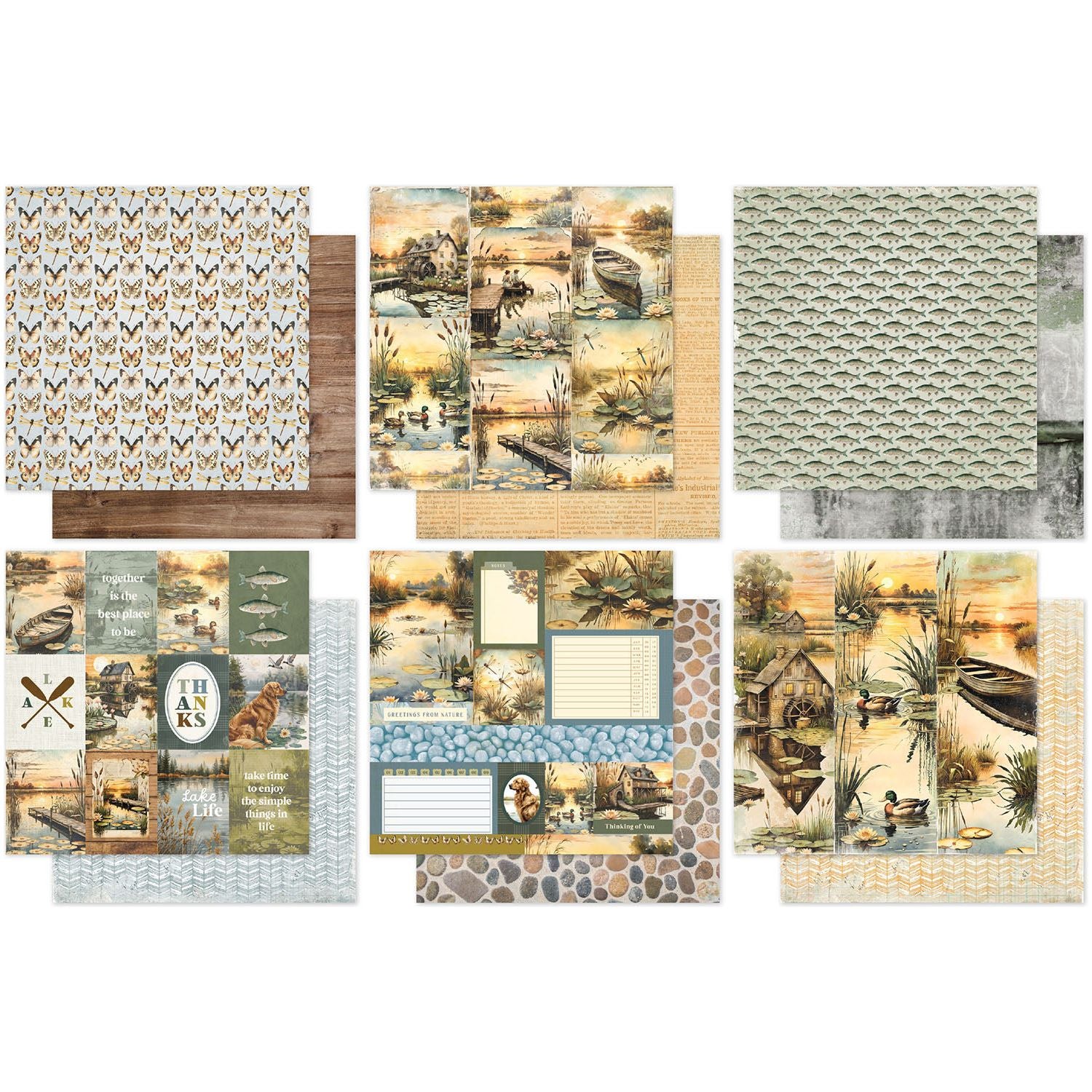 Paper Rose Lakeside Memories Paper is ideal for outdoor-themed crafting projects. This paper pack includes 12 double-sided sheets, each measuring approximately 12 x 12 inches and crafted from high-quality 200gsm cardstock. With 12 unique designs, each repeated two times, the collection features nature-inspired imagery such as butterflies, dragonflies, wooden textures, chevron patterns, pebbles, rocks, and fish. Additional designs include newspaper prints, notecards with lakeside scenes like fishing off piers, boats, country houses with water wheels, lilypads, cattails, dogs, ducks, and sunsets. Also included are ATC cards featuring similar imagery along with sentiments such as "together is the best place to be," "Thanks," "Lake Life," and "take time to enjoy the simple things in life."