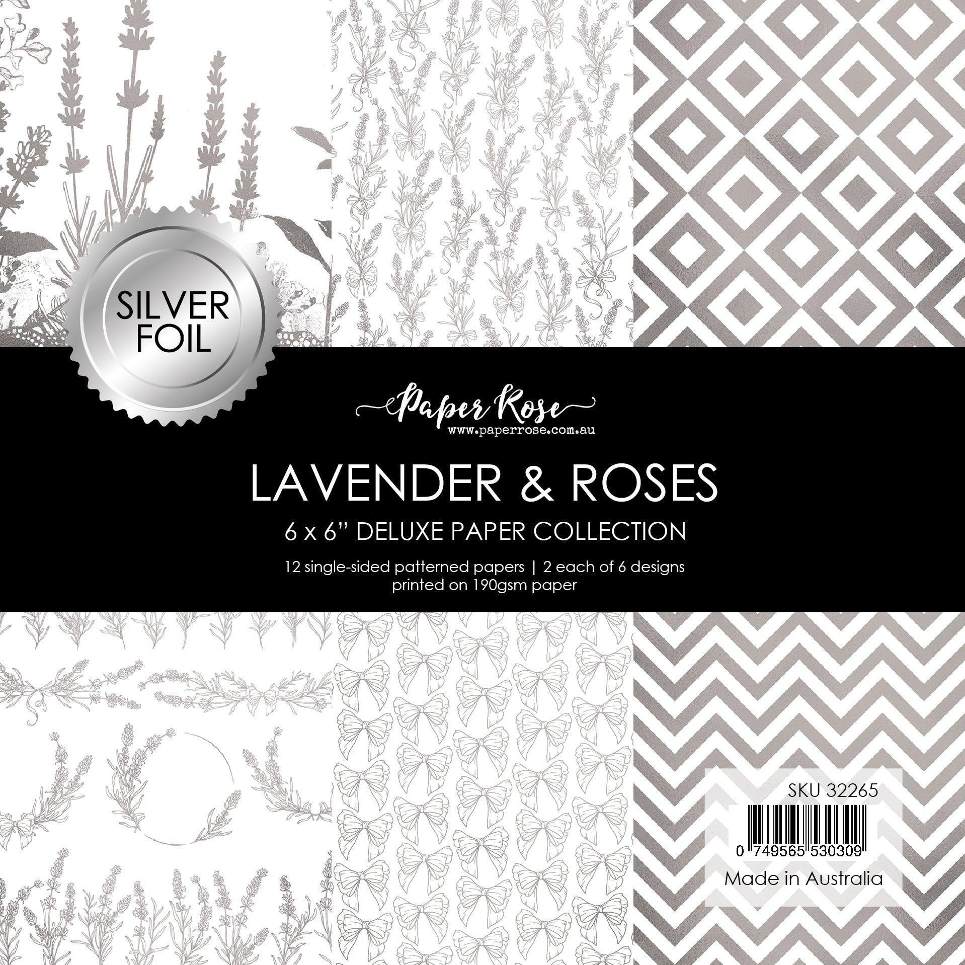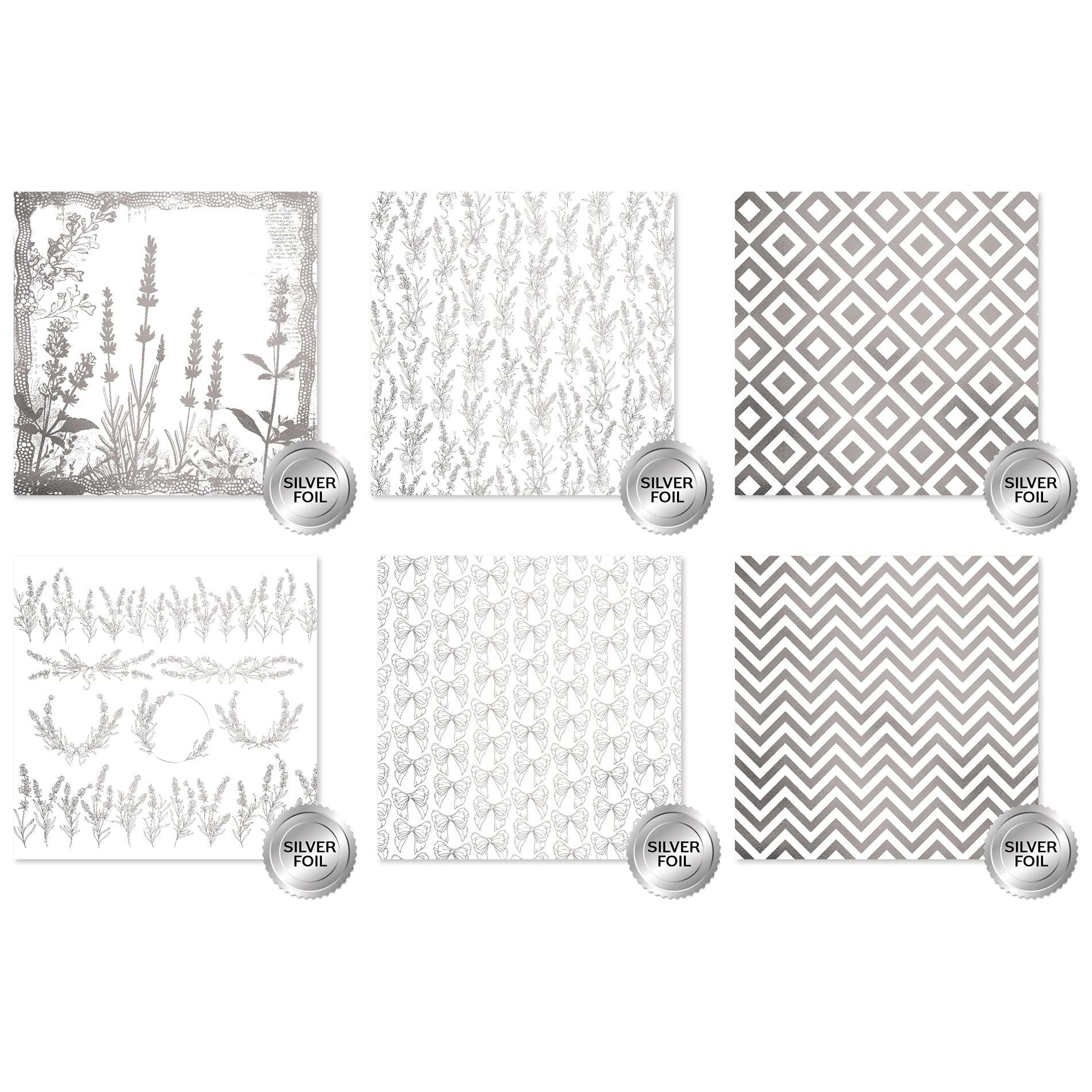 Paper Rose Lavender & Roses Silver Foil Deluxe is a luxurious addition to your crafting supplies. This pack includes 12 single-sided patterned papers, with 2 sheets each of 6 exquisite designs. Crafted from high-quality 190gsm paper, these papers boast both durability and elegance. Each sheet features captivating designs in Silver Foil, adding a touch of opulence to your projects. The patterns include chevron, diamond, bows, lavender sprigs, lavender wreaths, and lavender accent pieces, offering a harmonious blend of sophistication and botanical beauty.
