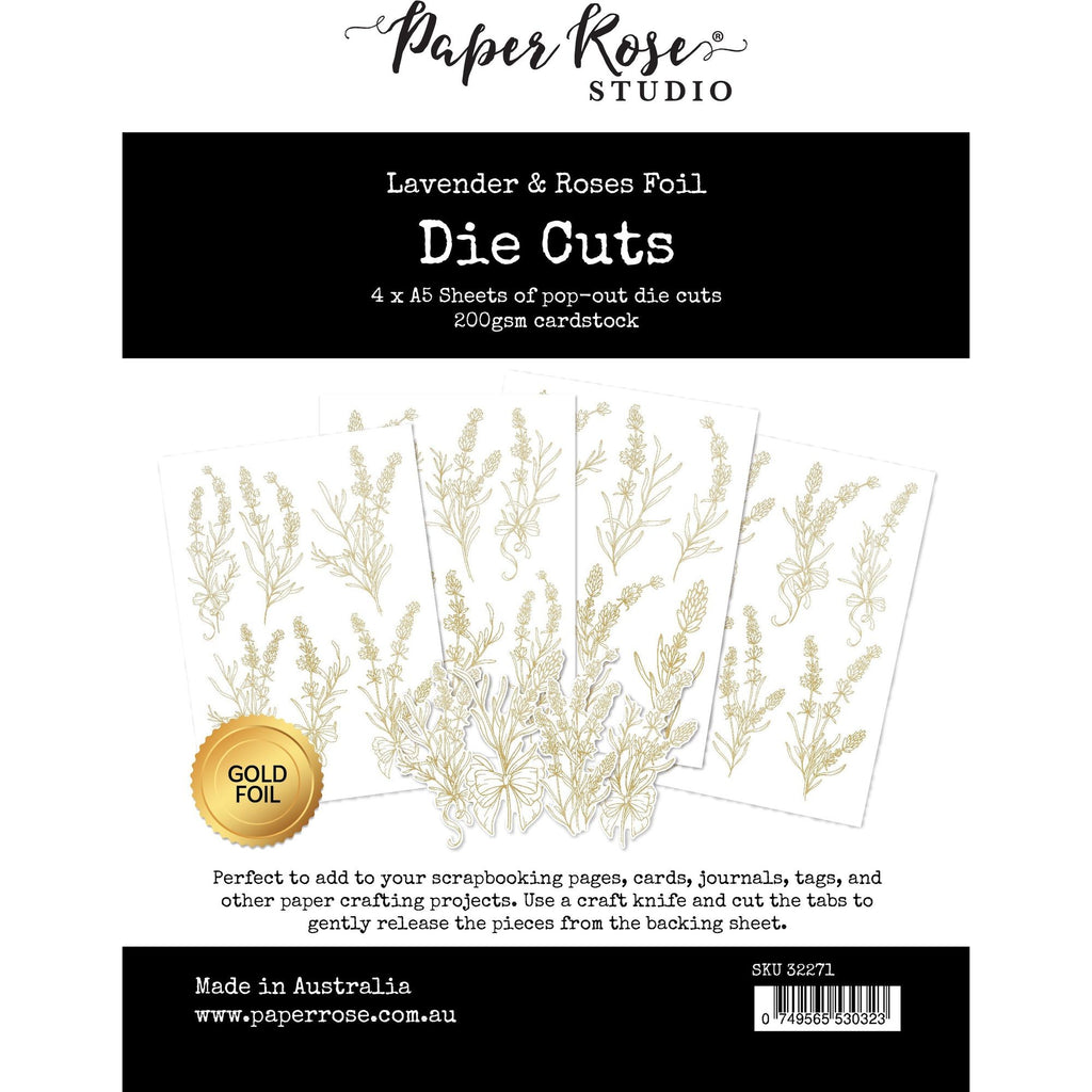 Paper Rose Lavender & Roses Gold Foil Die Cuts include four A5 sheets of pop-out die cuts, crafted from durable 200gsm paper for easy release from the backing sheet. Perfect to add to your scrapbooking pages, cards, journals, tags and other paper crafting project. Use a craft knife and cut the tabs to gently release the pieces from the backing sheet. The ephemera feature various sprigs of lavender, some adorned with leaves, some tied in bows, and others showcasing large blooms, each shimmering in captivating gold foil.