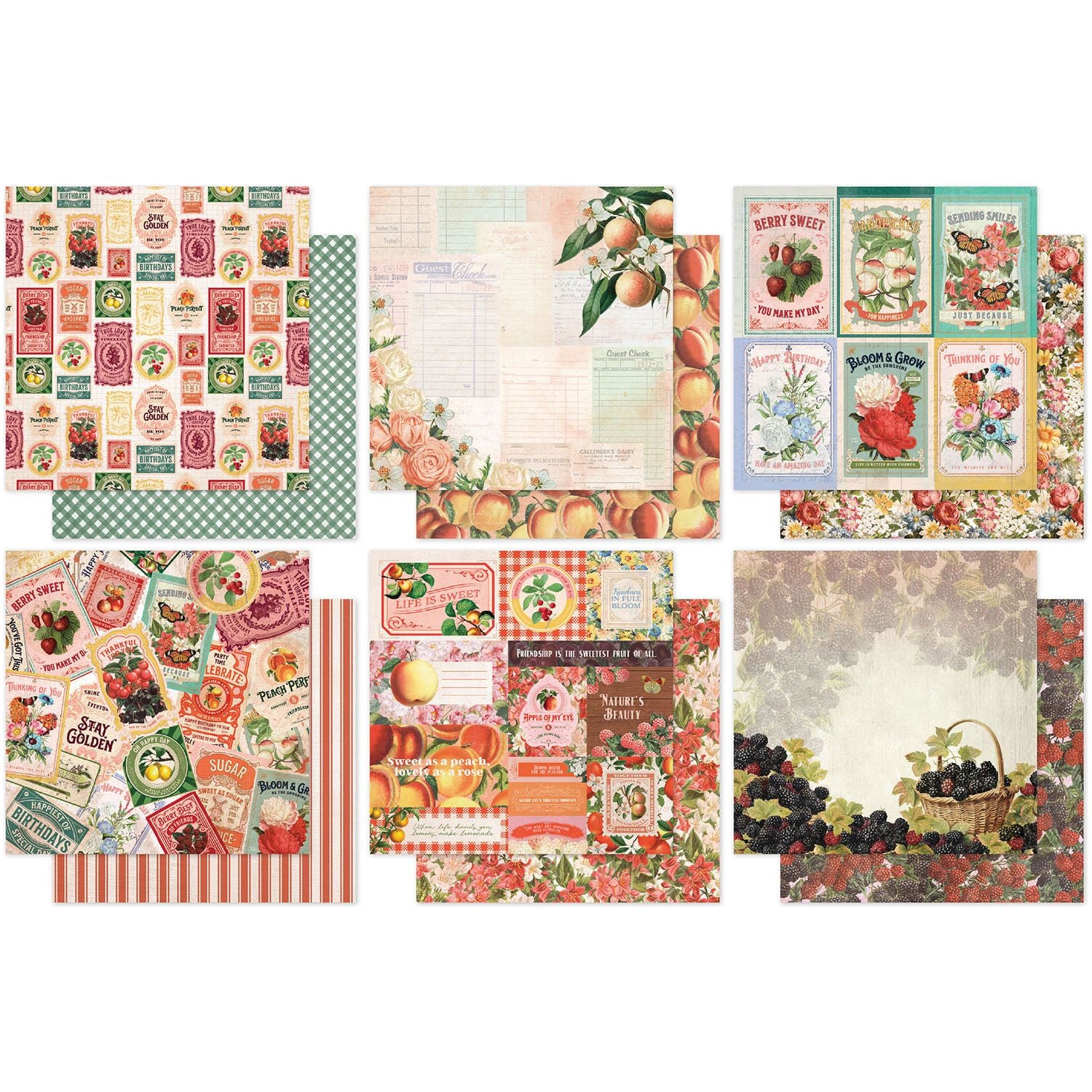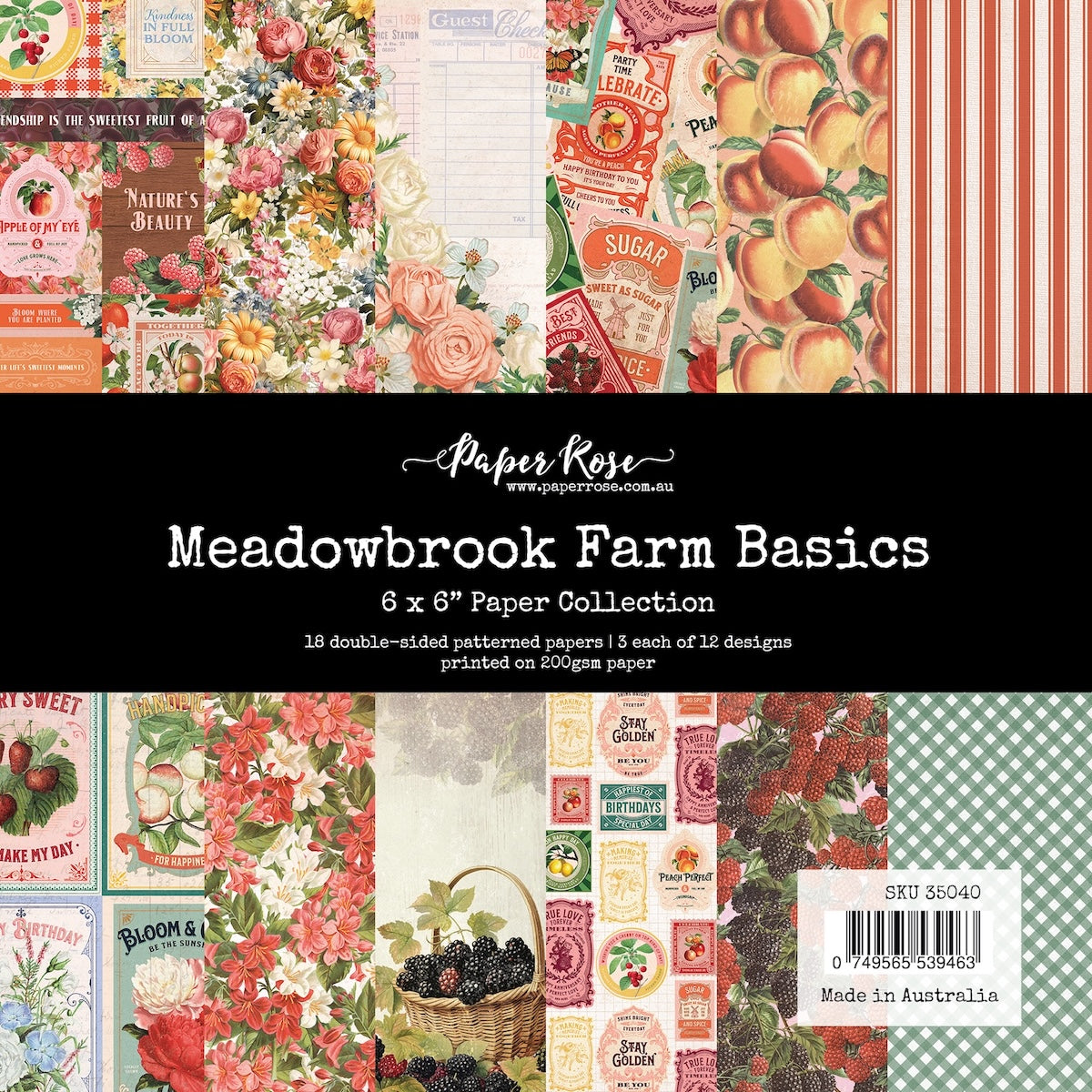 Paper Rose Meadowbrook Farms Basics Paper is a versatile addition to any crafting collection. This 6 x 6-inch (15.2 x 15.2 cm) paper pack includes 18 double-sided sheets of sturdy 200gsm paper, providing a durable, high-quality base for cardmaking, scrapbooking, and other creative projects. With 12 charming designs, each repeated three times, this collection brings a touch of countryside charm to your crafts. Patterns include green gingham, red stripes, sweet raspberries and blackberries, juicy peaches, blooming florals, vintage guest checkout receipts, classic labels, and seed packets featuring cheerful sentiments like "Happy Birthday," "Berry Sweet," "Sending Smiles," "Thinking of You," "Bloom & Grow," and more.