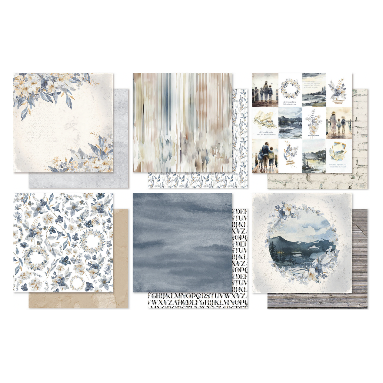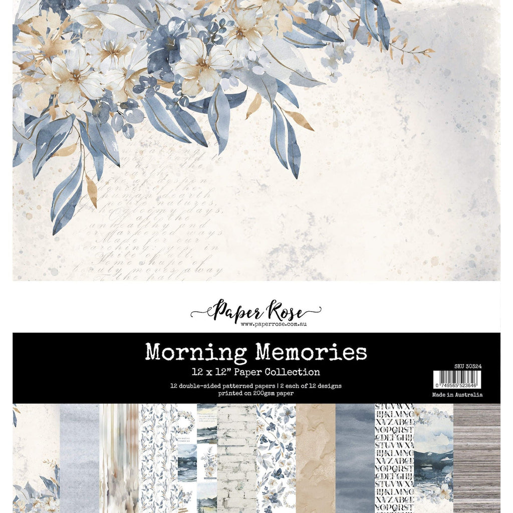 The Paper Rose Morning Memories 12x12 Paper is a stunning collection of double-sided patterned papers that evoke a sense of serenity. The pack includes 12 sheets in total, with 2 sheets each of 12 unique designs. The sheets measure approximately 12 x 12 inches and have a sturdy weight of 200gsm. The paper collection features a beautiful array of neutral colors in blues, tans, and grays, which create a soothing and calming aesthetic. The designs primarily focus on nature-inspired elements, with an emphasis on florals, watercolor washes, foliage, and stripes. In addition to the floral and nature motifs, the collection also includes sheets with distressed brick and wood patterns, offering a versatile option for adding texture and depth to your designs. Furthermore, there are small boxes featuring different scenes and phrases, adding a charming and whimsical element to your creations. The scenes depicted on the boxes include families looking over water, a river surrounded by trees, notepads, books, and flowers. These elements allow you to incorporate storytelling and evoke a sense of nostalgia and sentimental memories in your projects.
