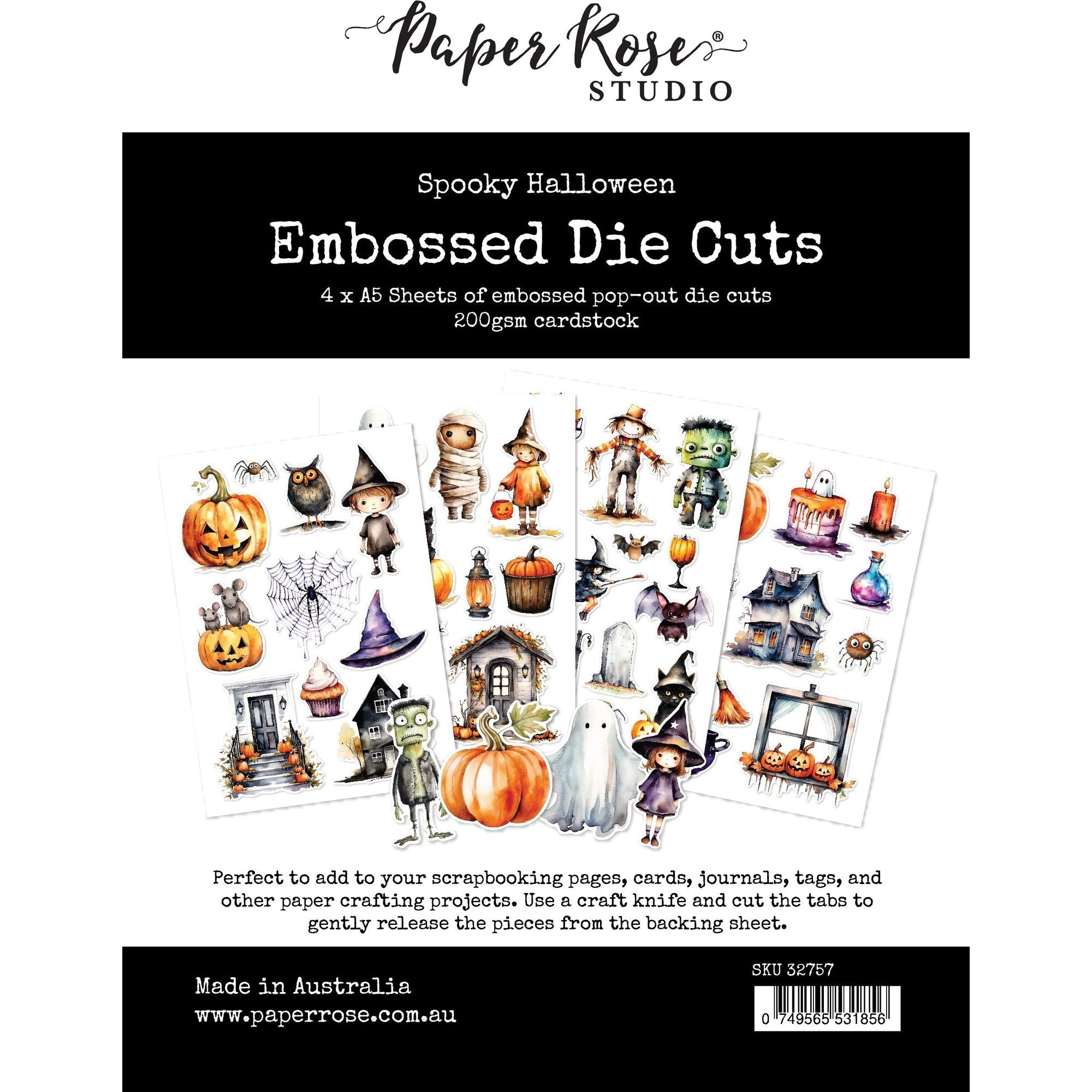 The Paper Rose Spooky Halloween Embossed Die Cuts are hauntingly perfect for adding a touch of spookiness to your Halloween crafts. This set includes four A5 sheets of pop-out die cuts, crafted from durable 200gsm paper for easy release from the backing sheet. The die cuts feature printed images with selectively embossed areas, adding depth and dimension to your creations. To use, simply employ a craft knife to carefully cut the tabs, allowing the die cuts to be gently removed without damage. The designs include an array of Halloween-themed elements such as jack-o'-lanterns, pumpkins, monsters, mummies, witches, spiders and webs, cupcakes, scarecrows, candles, haunted houses, tombstones, ghosts, and more. These die cuts are perfect for enhancing your Halloween projects with eerie yet delightful details.