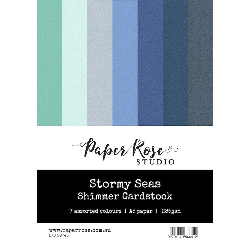 The Paper Rose Stormy Seas Assorted Shimmer A5 Cardstock is a pack of seven sheets of heavyweight paper with a stunning shimmer finish. Measuring approximately 8.25 x 5.875 inches and 285gsm, this cardstock is perfect for various crafting projects such as card bases, stamping, and die cutting. Each pack includes one sheet of each color, Sea Mist, Midnight Blue, SeaFoam, Winter Blue, Silver Cloud, Slate Grey and Blue Sky, adding a beautiful touch to your projects. With its bright and eye-catching colors and shimmer finish, this cardstock is an excellent choice for adding some elegance and sparkle to your crafts.