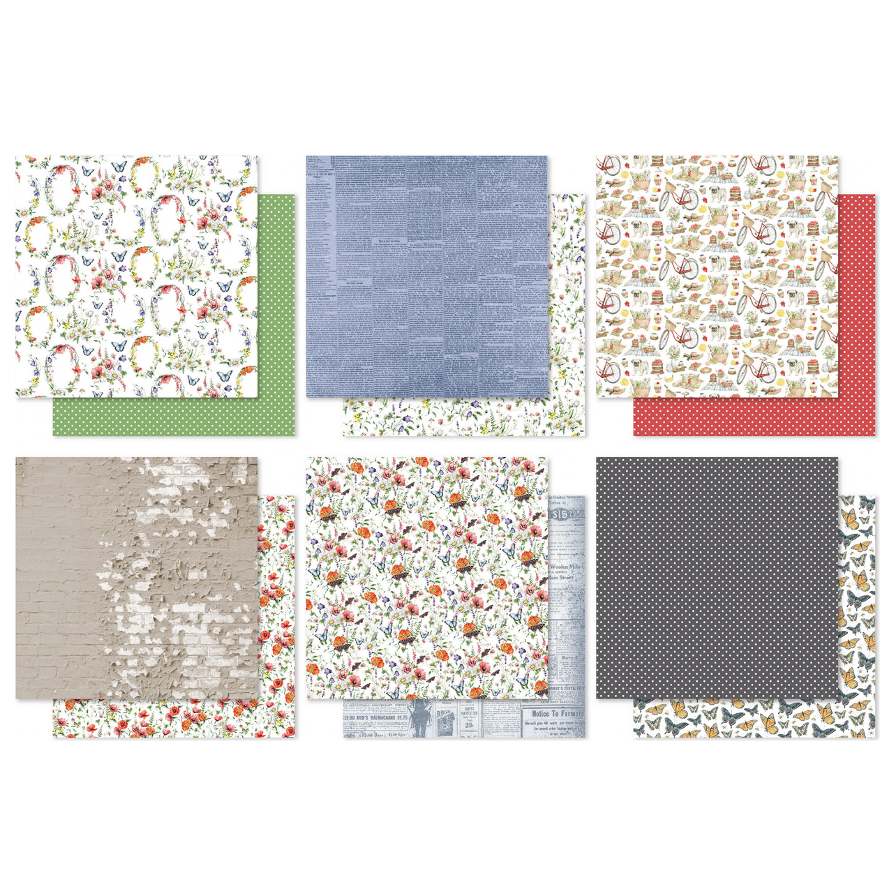 The pack includes a range of patterns that capture the essence of a summer picnic. These designs feature flowers and textures like peeling paint off of a brick wall, newspaper, polka dots, butterflies, wreaths, bicycles, and picnic images. These patterns are perfect for creating handmade cards, scrapbook pages, and other paper crafts that celebrate the warmth and joy of summertime.