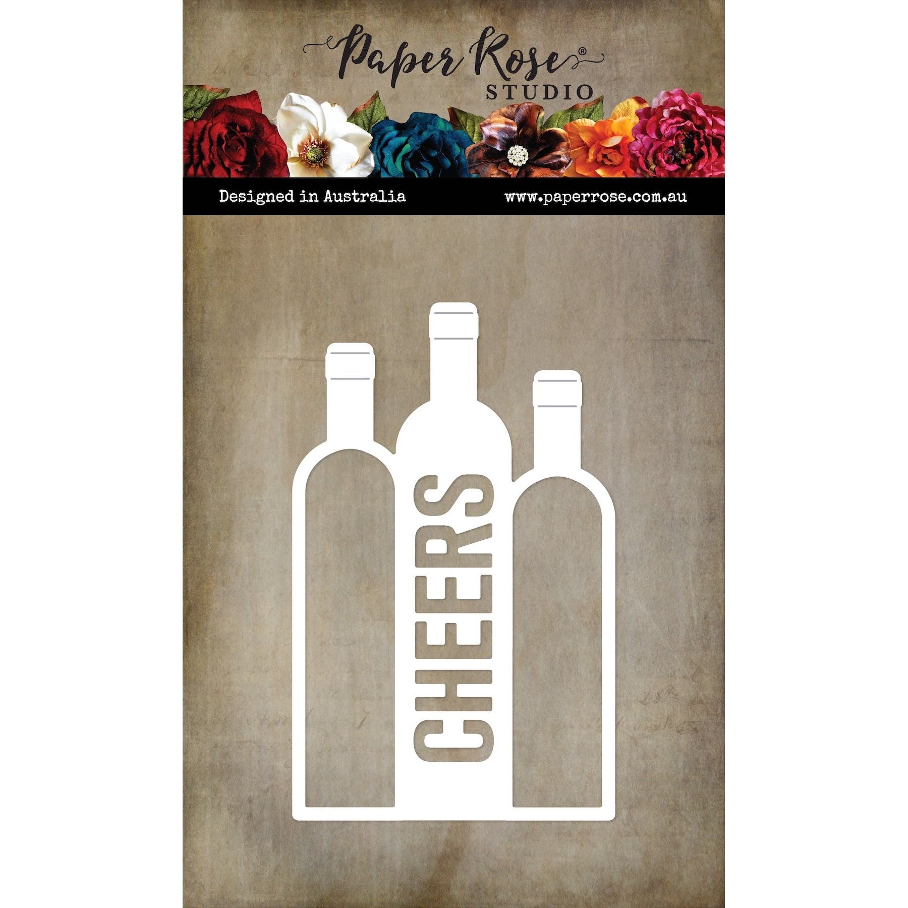 The Paper Rose Trio of Wine Bottles Cheers Die is a fun addition to your craft stash. This wafer-thin die, measuring approximately 4.4 x 2.8 inches, is compatible with most die-cutting machines. The design features three wine bottles lined up together, with the outer two bottles open and the middle one displaying the word "Cheers." It's a perfect die for creating festive holiday projects.