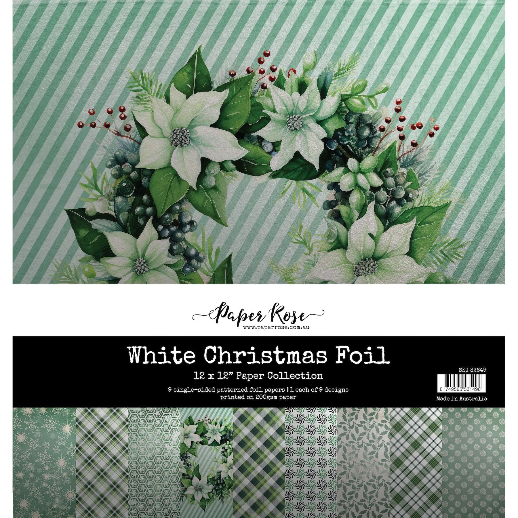 The Paper Rose White Christmas Foil Paper Collection adds a delightful winter touch to your crafting projects. This collection features 9 single-sided foiled patterned papers, each measuring approximately 12 x 12 inches and weighing 200gsm. The designs include diagonal stripes with a poinsettia wreath, snowflakes, various plaids, peppermint swirls, holly leaves, and berries. These elegant and festive papers are perfect for creating beautiful holiday cards, scrapbook pages, and other winter-themed crafts.