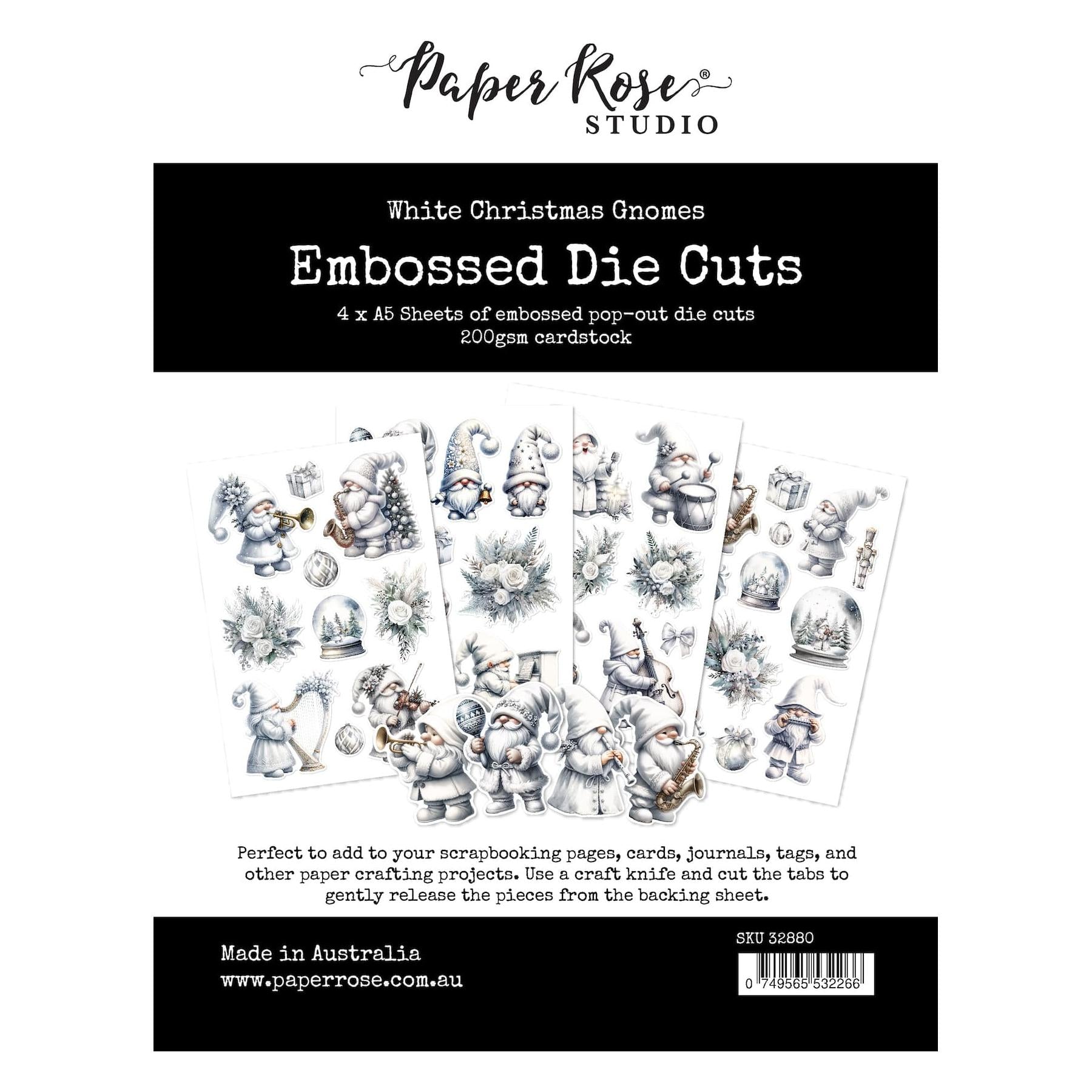 Paper Rose White Christmas Gnomes Embossed Die Cuts add a whimsical, festive touch to your crafting supplies. This set includes four A5 sheets of pop-out die cuts, made from sturdy 200gsm paper for easy release from the backing sheet. The die cuts feature beautifully printed images with selectively embossed areas, enhancing the depth and dimension of your projects. To use, simply employ a craft knife to cut the tabs, allowing the die cuts to be gently removed without damage. Designs include gnomes playing various musical instruments, white roses, ornaments, snow globes, presents, and toy soldiers.