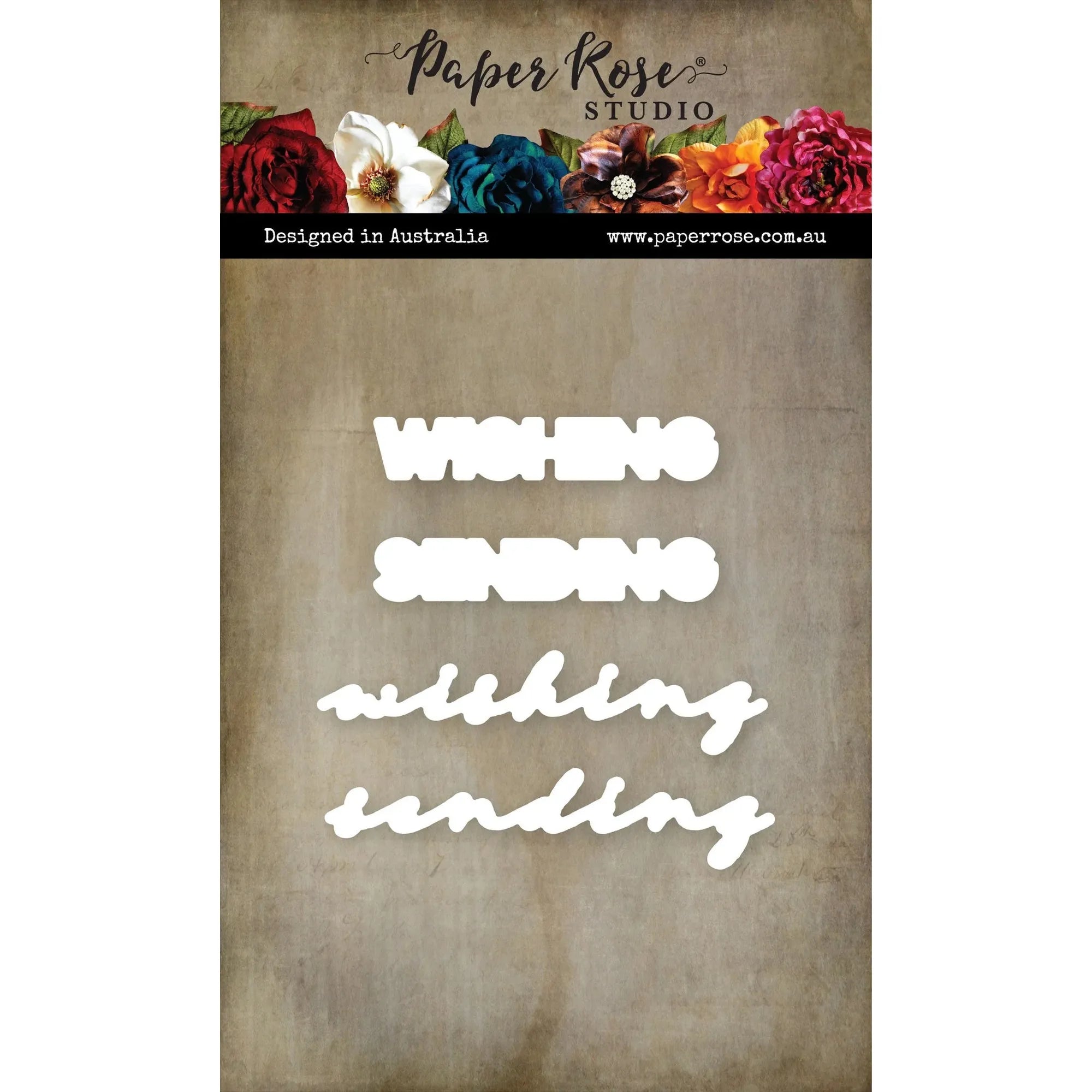 Paper Rose Wishing and Sending Sentiment Dies includes four wafer-thin metal dies designed to coordinate with the Wishing and Sending Sentiments Clear Stamps 34395. This set cuts out two variations of the word “wishing” and two variations of “sending,” making it easy to add polished, dimensional greetings to your projects. Compatible with most leading die-cutting machines, these versatile dies are perfect for enhancing cards, scrapbook pages, and other paper crafts.