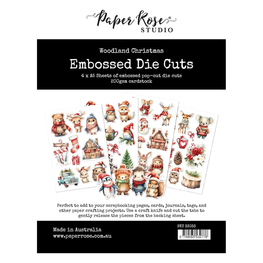 The Paper Rose Woodland Christmas Embossed Die Cuts bring a festive charm to your crafting supplies. This set includes four A5 sheets of pop-out die cuts made from sturdy 200gsm paper, allowing for easy release from the backing sheet. The die cuts are beautifully printed with selectively embossed areas, adding extra depth and dimension to your projects. The designs feature a variety of tag shapes, some left blank for customization, others labeled with "To" and "From," and others with sentiments like Happy Holidays, Special Delivery, Winter Wishes, Merry Christmas, and Joy to the World. The imagery includes festive elements such as trees, snow globes, bells, holly, pine sprigs, ornaments, cocoa, bells, and various animals. These die cuts are perfect for creating gift tags, holiday cards, and scrapbook pages with a festive woodland theme.