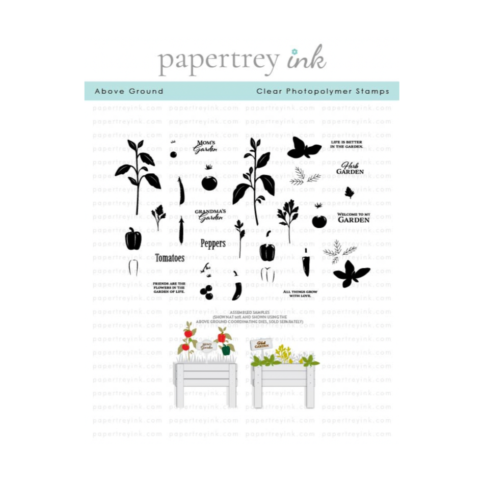 Papertrey Ink Above Ground Clear Stamps is a 4x6 inch garden-inspired collection that brings the charm of homegrown goodness to your handmade cards. Stamp ripe tomatoes, vibrant peppers, and fresh sprigs of herbs to create cheerful, farm-to-card scenes. The set also includes a variety of fun sentiments to complete your designs. Coordinating Above Ground Dies PTI-0970 sold separately.