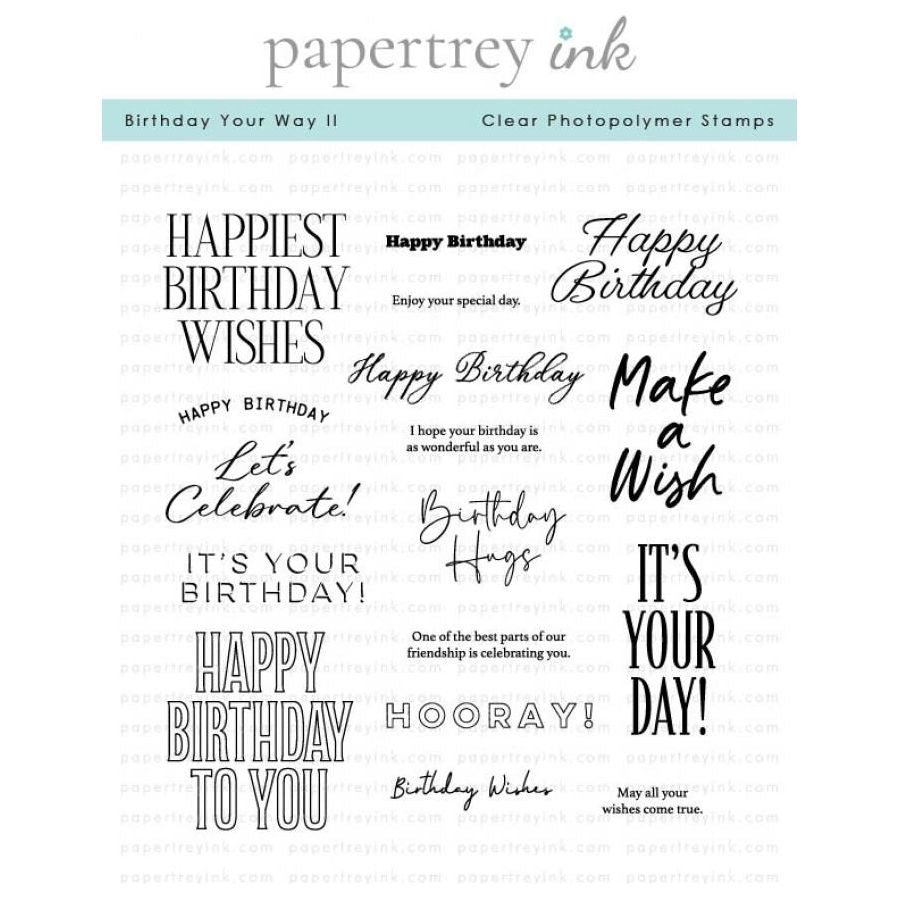 Introducing the Papertrey Ink Birthday Your Way II Clear Stamps, the highly-anticipated sequel to our popular Birthday Your Way set. Get ready to ink up and celebrate in style! This set offers an array of fonts, styles, and sizes, allowing you to create the perfect birthday message every time. No matter who the recipient is, this set equips you with everything needed to make their day special. With birthdays occurring year-round, you'll find yourself reaching for this set repeatedly. Don't miss the chance to enrich your collection with this versatile set. Order now and make every birthday extra memorable with Birthday Your Way II!