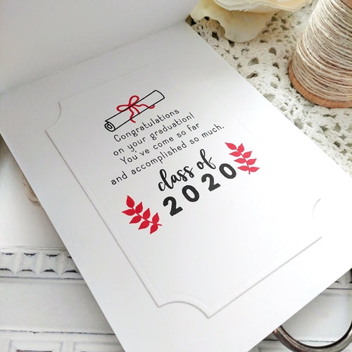 Many of us struggle when it comes to filling the space on the inside of our greeting cards. With Inside Greetings, a series of sentiment stamps, we’ve done the work for you! These longer messages in simple fonts take the guesswork out of that task. Graduation features 3 messages you can use to send graduates off on the next leg of their journey with pride and encouragement.