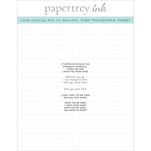 Many of us struggle when it comes to filling the space on the inside of our greeting cards. With Inside Greetings, a series of sentiment stamps, Papertrey has done the work for you! These longer messages in simple fonts take the guesswork out of that task. Wish You Were Here includes 5 messages to choose from when the ones you love are far away from you.