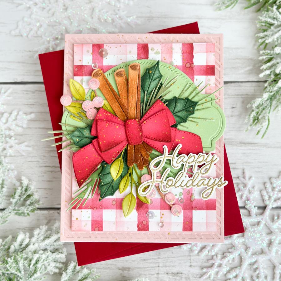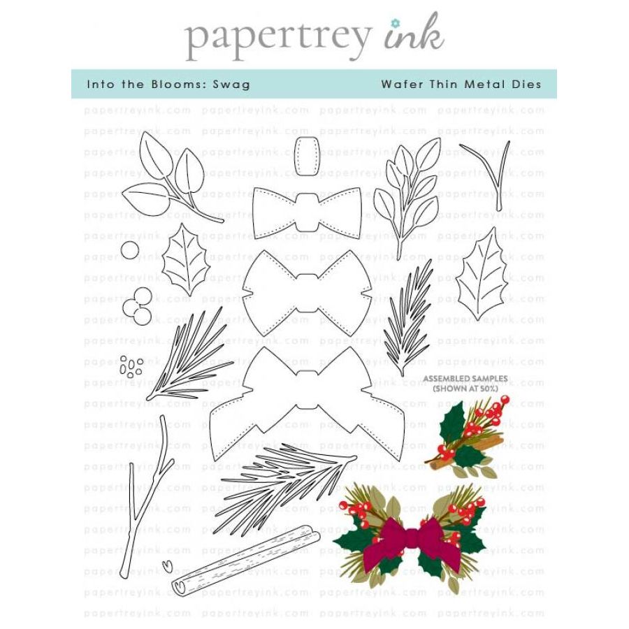 Papertrey Ink Into the Blooms Swag Dies contains everything you need to create beautiful holiday arrangements, including bows, pine branches, holly leaves, berries, cinnamon sticks, and more. The set includes 18 wired shapes.