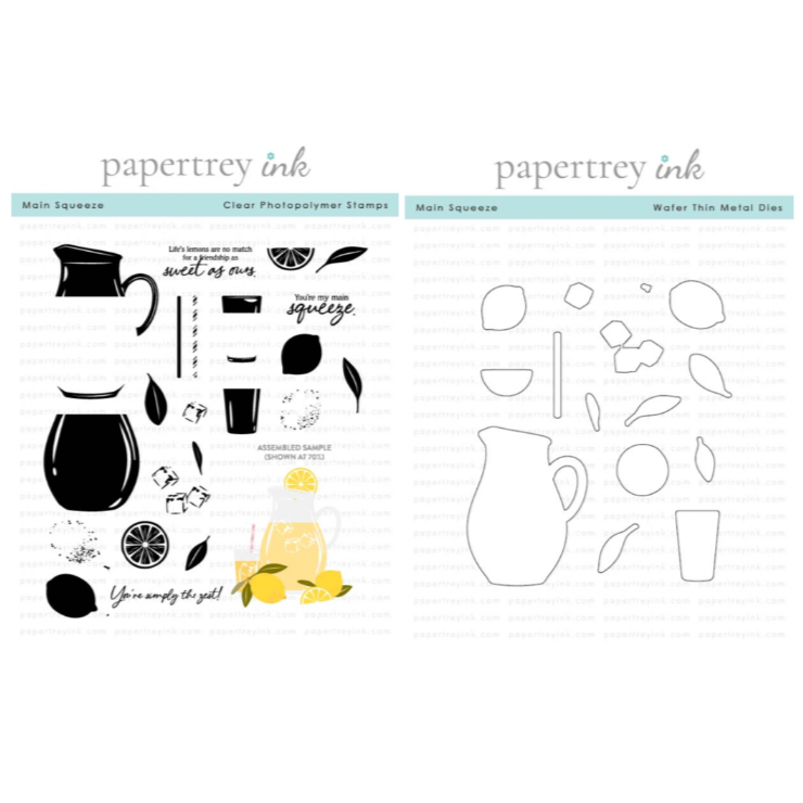 Papertrey Ink Main Squeeze Clear Stamp and Die Set is a cheerful and refreshing collection perfect for crafting citrus-themed projects full of summer charm. The Main Squeeze Clear Stamps 1638, comes on two 4 x 6 inch clear sheets featuring a classic lemonade pitcher, juicy lemons, slices, a glass, straw, ice cubes, leaves, and fun coordinating sentiments—everything you need to quench your creative thirst.