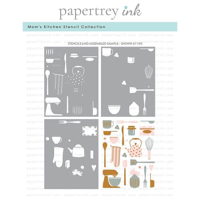 Papertrey Ink Mom's Kitchen Stencils is a charming set of three background stencils featuring classic elements found in the heart of the home—the kitchen. Celebrate the love and warmth that cooking and baking bring by creating heartfelt cards and projects that feel like home. These stencils can be used on their own or paired with the Mom's Kitchen clear stamps 1632, sold separately. Each stencil measures 4.25 x 5.5 inches.