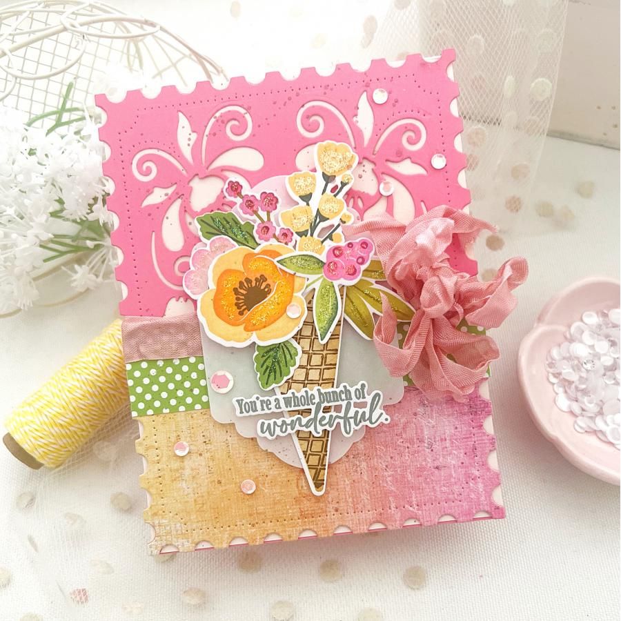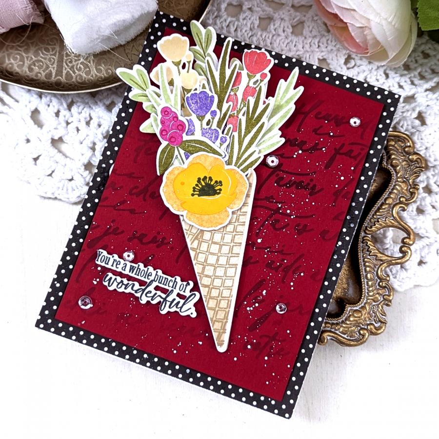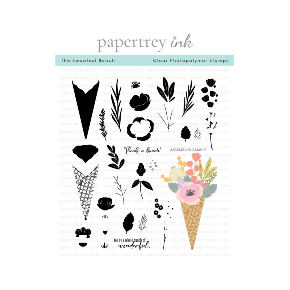 Papertrey Ink The Sweetest Bunch Clear Stamps puts a playful twist on traditional florals by combining a blooming bouquet with the whimsy of an ice cream waffle cone. Fill the cone with a bunch of beautiful blooms to create the perfect blend of sweet and stunning. This charming set adds a scoop of joy to every card. Coordinating The Sweetest Bunch Dies PTI-0971 sold separately. This clear stamp set comes on two 4x6 inch clear sheets!