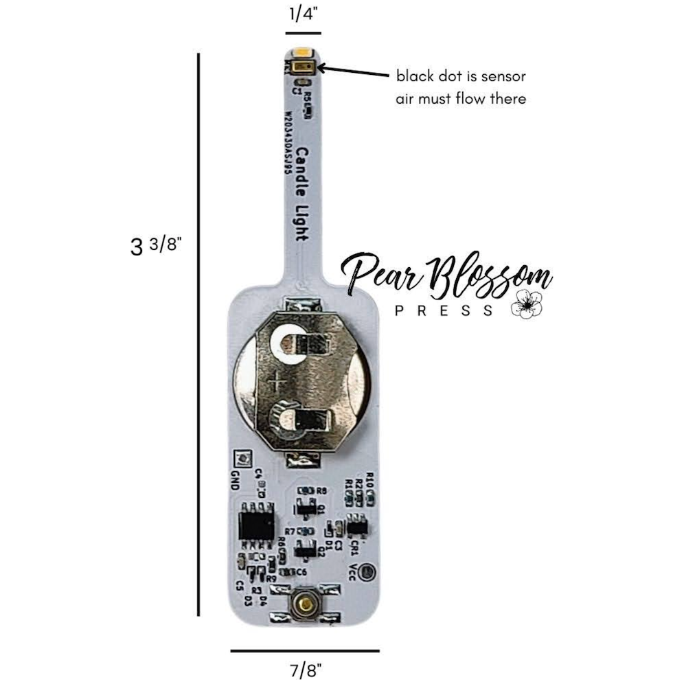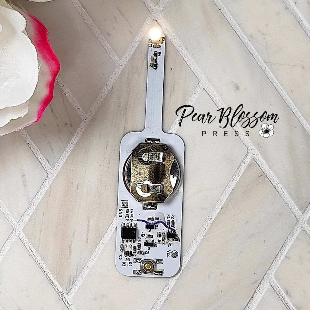 The Pear Blossom Press Candle Light 2 Pack is an innovative crafting solution that brings a unique twist to light-up projects. Each all-in-one unit features a single white LED at the top, with included batteries for immediate use. Unlike traditional lights, these units require a breath to extinguish the light after pressing the button to turn it on. For battery preservation, the LED will automatically switch off after about 60 seconds—just enough time to sing Happy Birthday!