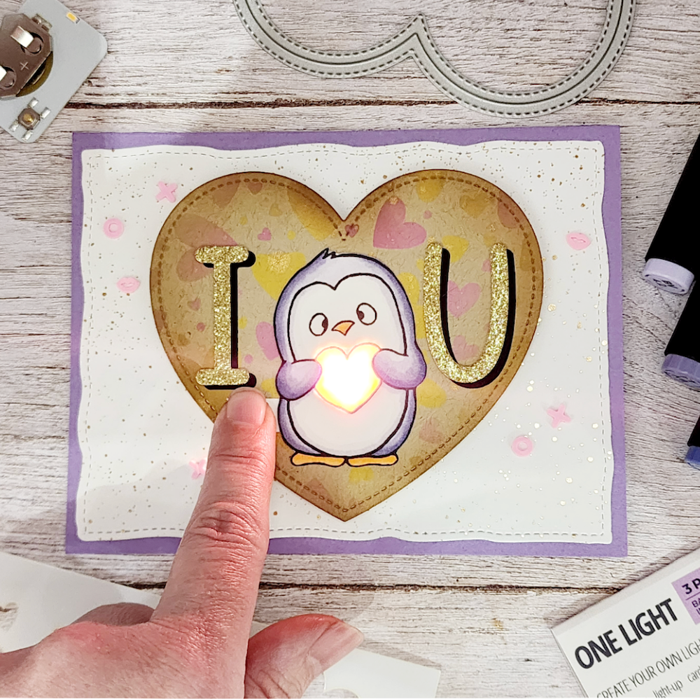 To use, adhere in place. Cover with decorative elements, and be sure to mark 'push' over the button so the recipient knows how to turn the light on.