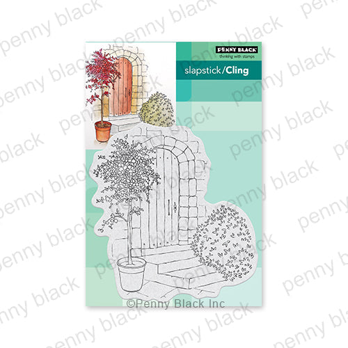 Introducing the Penny Black Artful Entry Cling Stamp, a captivating stamp featuring a picturesque scene of a stone entryway with a wooden planked door. This charming image includes detailed elements such as steps leading to the door, a potted tree beside it, and a blooming bush on the other side, adding depth and realism to your projects. Whether you're creating cards, scrapbook layouts, or other paper crafts, the Artful Entry Cling Stamp offers endless creative possibilities for adding rustic charm and character to your designs. Let your creativity flourish with the Penny Black Artful Entry Cling Stamp!