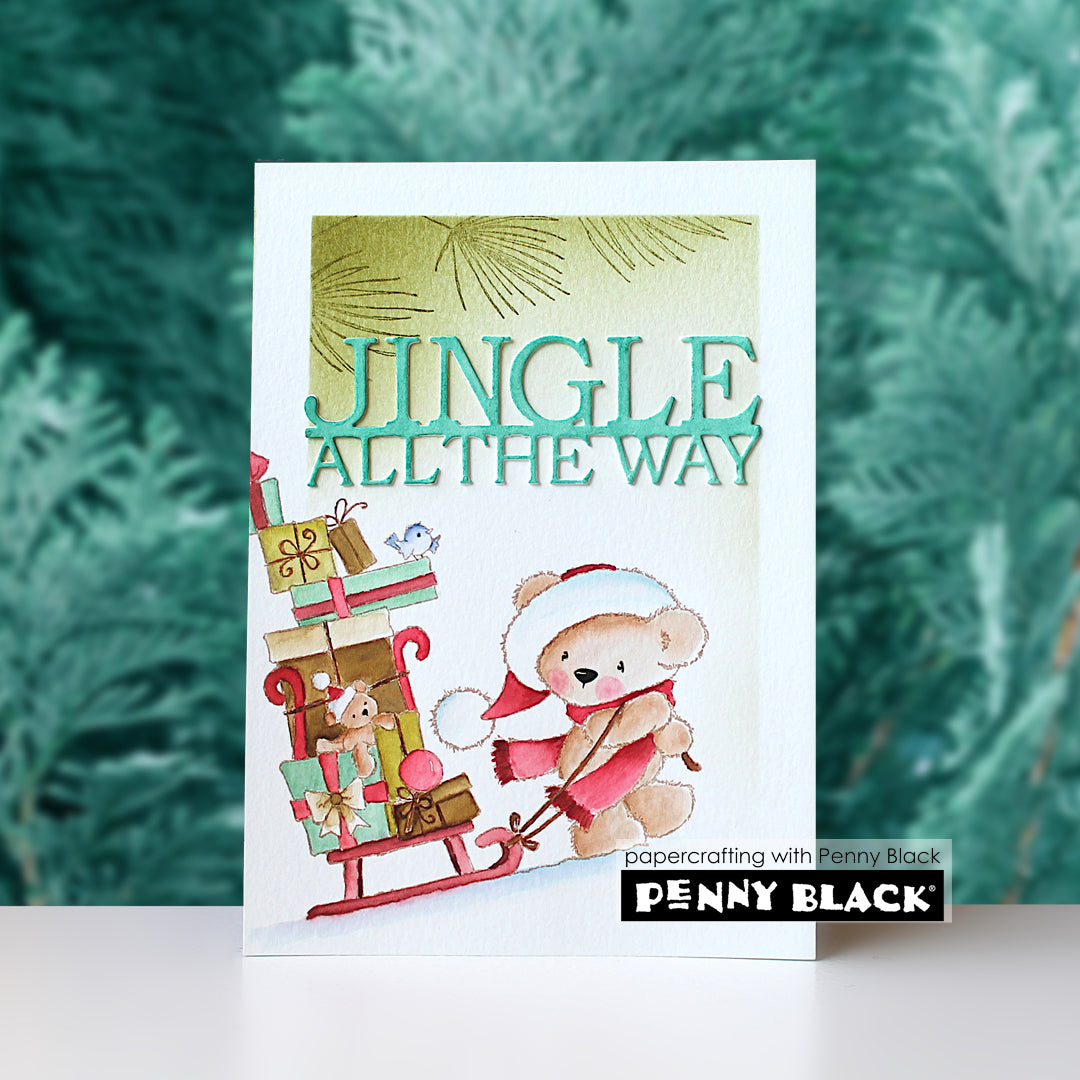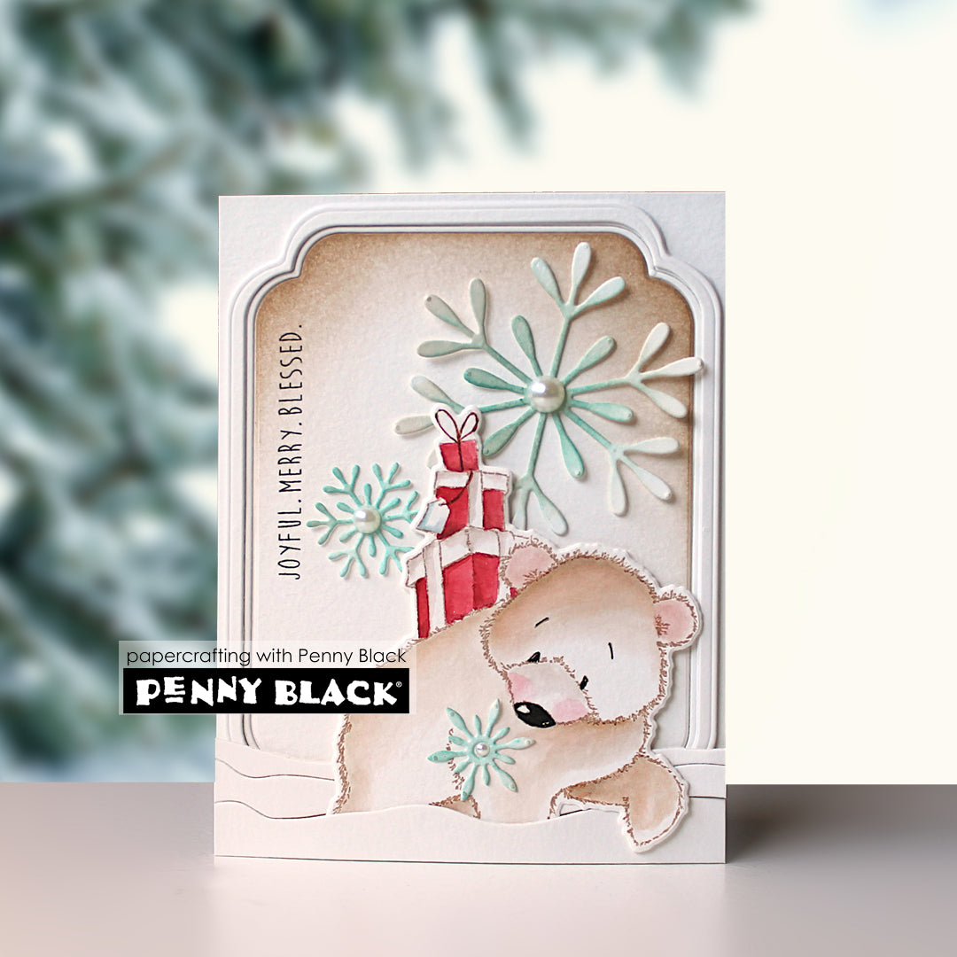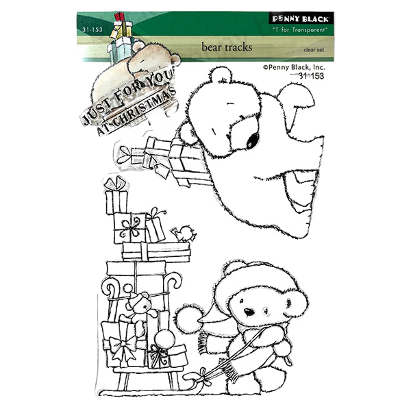 Penny Black Bear Tracks Clear Stamps is a 5 x 6.5 inch set featuring two charming images: a polar bear carrying a tall stack of gifts on its back, and a small bear pulling a sled full of presents. The set also includes one coordinating sentiment. Pairs with the Bear Tracks Cut Out Dies 51-932, sold separately.