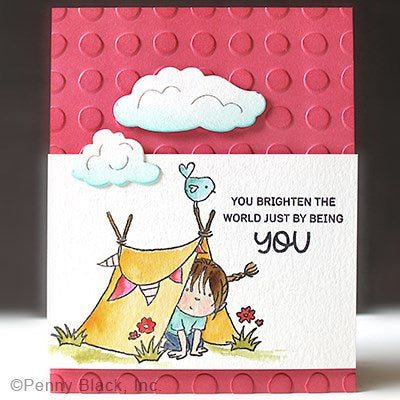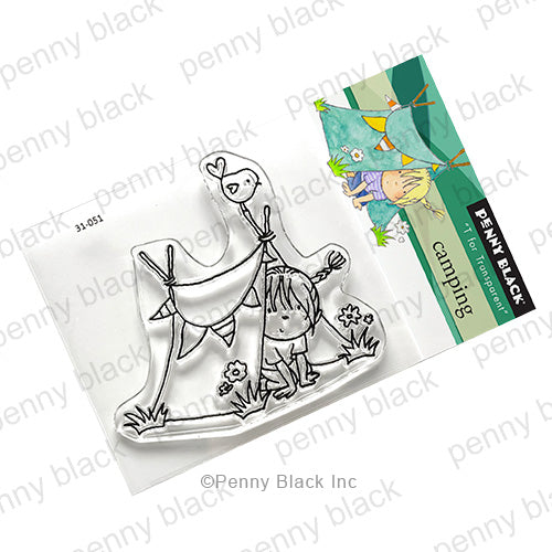 Introducing the Penny Black Camping Clear Stamp, a delightful 3x4 inch stamp capturing the whimsical charm of a camping adventure! This charming image features a sweet girl hiding in her homemade tent, adorned with colorful flags, while a friendly bird perches above her. Whether you're creating cards, scrapbook layouts, or other paper crafts, this stamp offers endless creative possibilities for conveying the joy and wonder of outdoor exploration. Let your imagination take flight with the Penny Black Camping Clear Stamp!