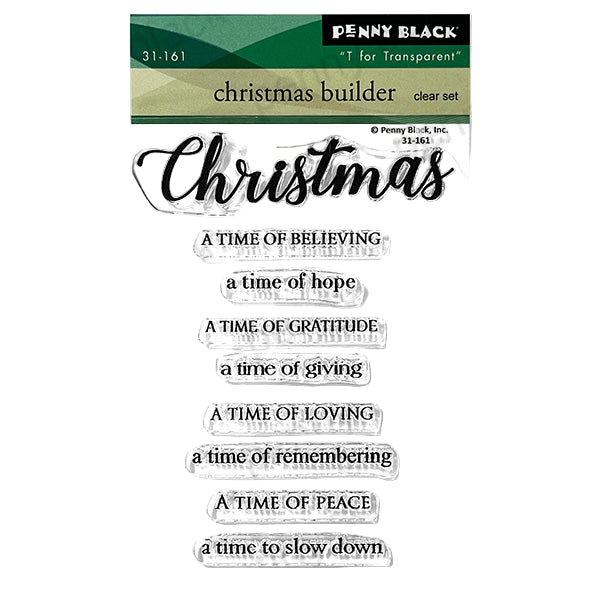 Penny Black Christmas Builder Clear Stamps is a 3x4 inch set featuring a large script Christmas sentiment along with 8 coordinating sub-sentiments. Perfect for mixing and matching to create custom holiday greetings for your seasonal projects.