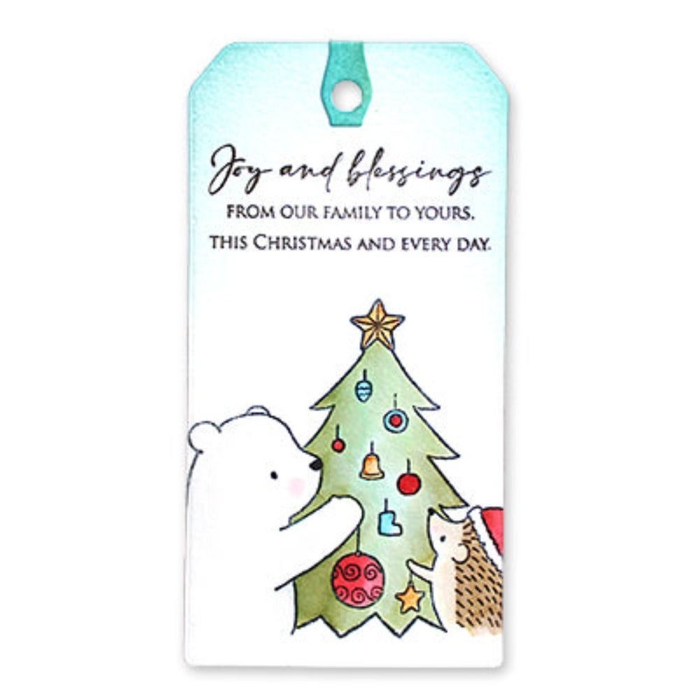 The Penny Black Clear Stamps Bright Spirits is a 3x4 inch clear stamp set that features an adorable image of a bear and a hedgehog hanging ornaments on a Christmas tree, adding a delightful touch to your holiday-themed crafting projects.