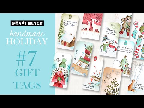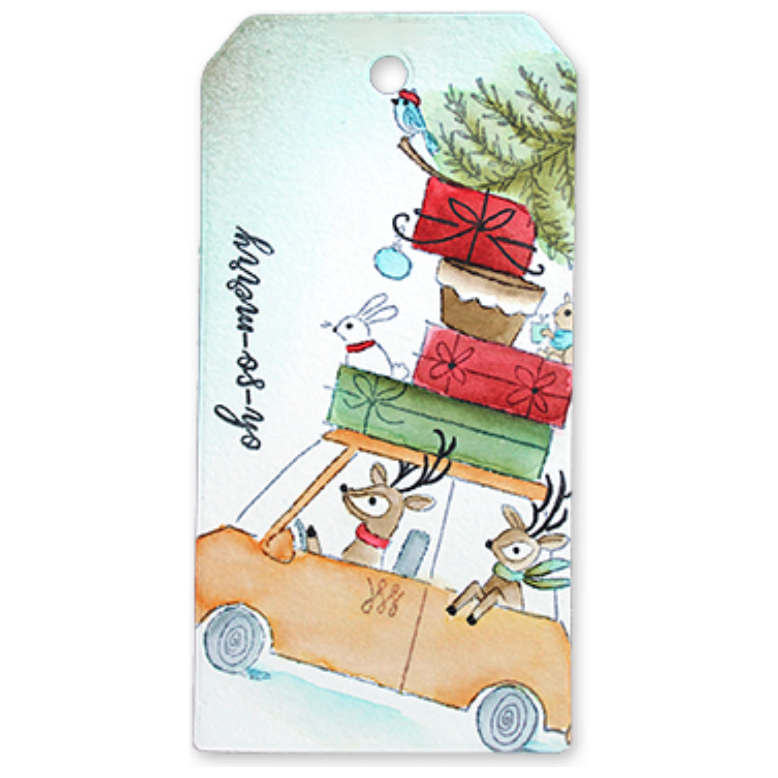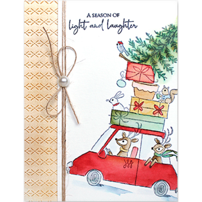 The Penny Black Clear Stamps Merrily is a 4x6 inch clear stamp set that includes 6 stamps. The images in this set feature pine trees, an image of two reindeer driving a car stacked high with wrapped gifts, a rabbit, a squirrel, and a holiday tree.