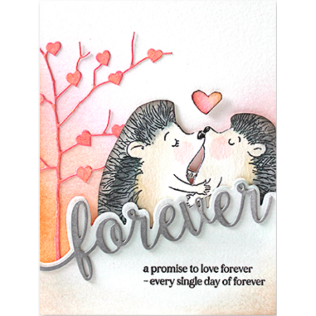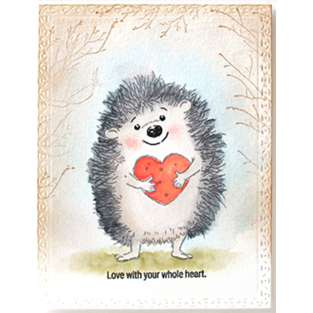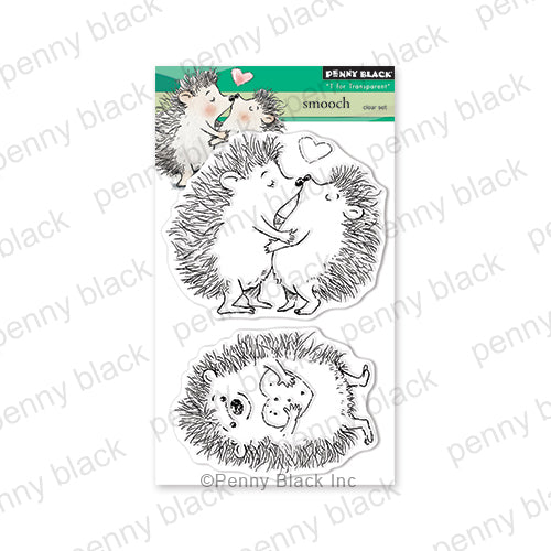 The Penny Black Clear Stamps Smooch is a 4x6 inch clear stamp set featuring two charming images of hedgehogs. One image depicts a loving couple sharing a kiss, while the other shows a hedgehog holding a heart.