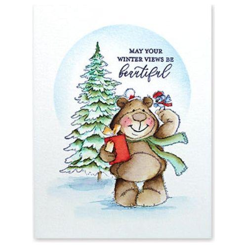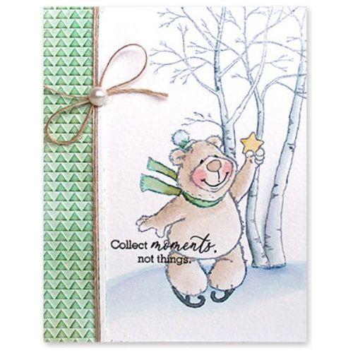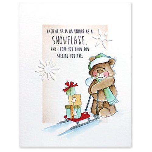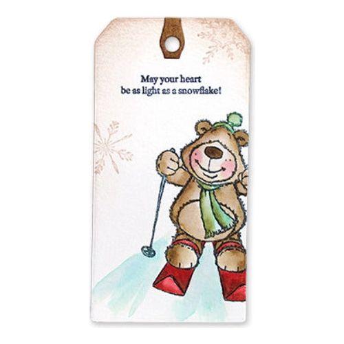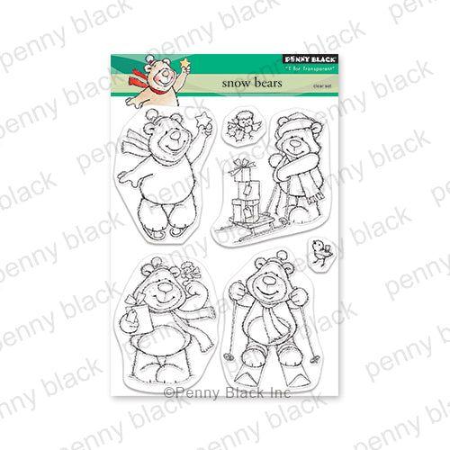 The Penny Black Clear Stamps Snow Bears is a 5x6.5 inch clear stamp set that features adorable bears engaged in various winter activities, including ice skating, skiing, holding gifts, and pulling a sled of presents. There is also a cute little bird.