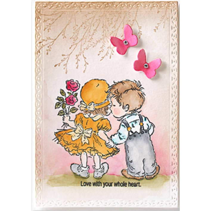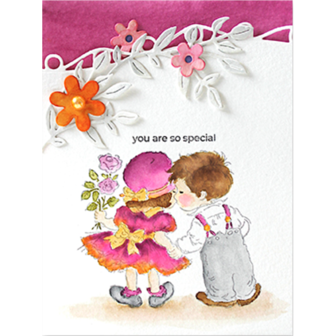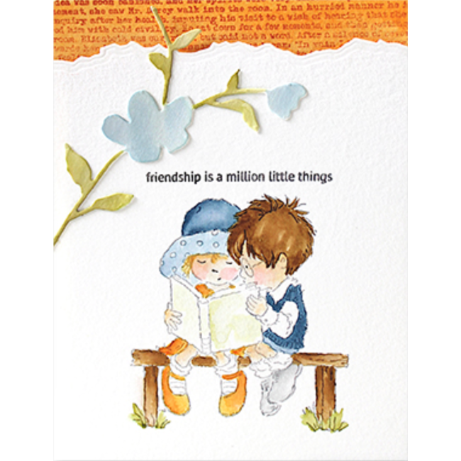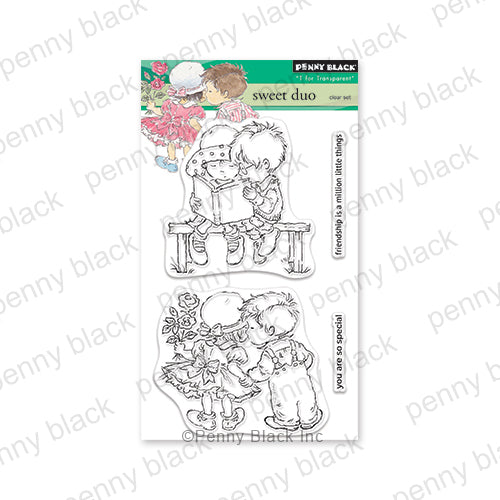 The Penny Black Clear Stamps Sweet Duo is a 4x6 inch clear stamp set that includes two heartwarming images of a little boy and girl. One image portrays them sitting on a bench, reading a book together, while the other image captures them in an affectionate moment from behind as they kiss and hold hands. Additionally, this set offers two heartfelt sentiments.