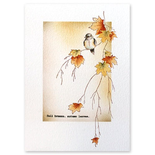 The Penny Black Cling Stamp Autumn Masterpiece showcases a serene scene with a small bird perched on a branch. Its approximate measurement is 3.12 inches in width and 6.5 inches in height. This stamp is perfect for adding a peaceful and nature-inspired touch to your crafting projects.