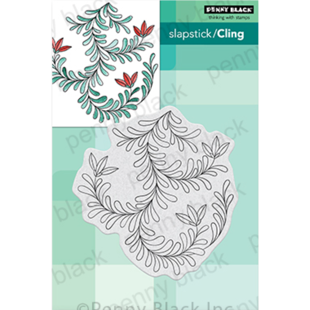 The Penny Black Cling Stamp Cheery Image showcases a flourishing plant vine adorned with leaves and flowers. This stamp measures 3.8 x 4 inches in size.