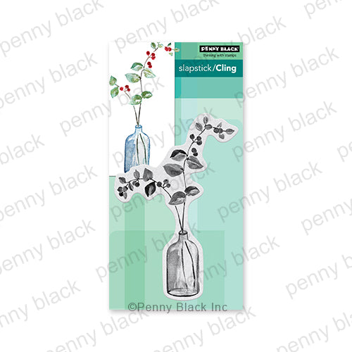 The Penny Black Cling Stamp Simply features an image of branches with leaves and berries in a glass vase container. Its approximate measurement is 3.5 x 5.4 inches
