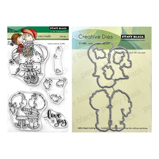 The Penny Black Cute Couple Clear Stamp 31-127 and Die 51-886 Set includes a 4x6-inch clear stamp set with 4 image stamps and 1 sentiment. The images feature a couple drinking a milkshake together, cuddling while walking, three little flying birds, and three hearts. The set also includes 5 coordinating outline dies, perfect for adding dimension and detail to your crafting projects.