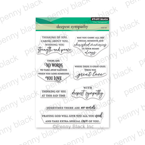Introducing the Penny Black Deepest Sympathy Clear Stamps, a heartfelt collection featuring an array of sentiments designed to express condolences and support during difficult times. This 5 x 5.6 inch clear stamp set includes eight thoughtful sentiments, offering a compassionate way to convey sympathy and comfort to those in need. Whether you're crafting sympathy cards, expressing condolences in scrapbook layouts, or creating other projects, these stamps provide heartfelt messages to express your deepest sympathy. Let your caring sentiments shine with the Penny Black Deepest Sympathy Clear Stamps.