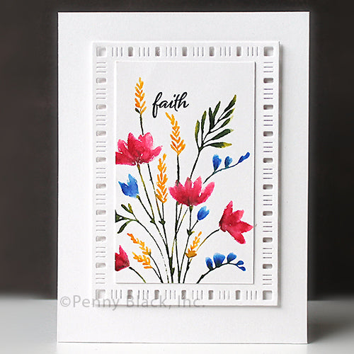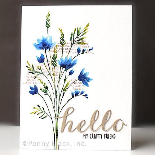 Penny Black Delicate Blossoms Cling Stamp is a single cling stamp featuring a beautifully detailed bouquet of wildflowers, perfect for adding an elegant floral touch to your projects. The stamp measures approximately 2.62 x 5.75 inches.
